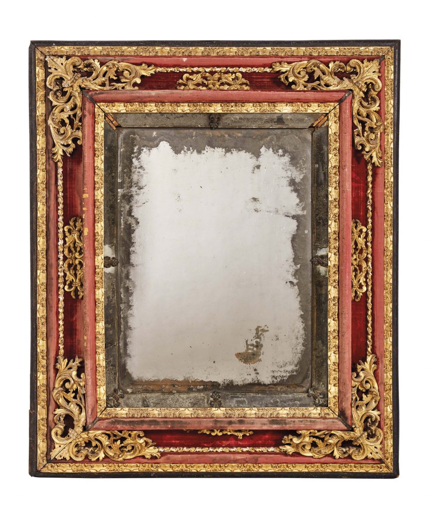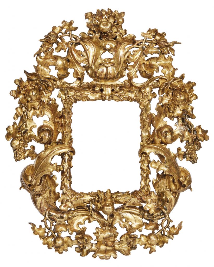 Spigolando tra gli splendidi esempi di questa articolata produzione attraversiamo la penisola da nord a sud partendo da una CORNICE piemontese del XVII secolo intagliata e dorata con fondo bulinato per la quale sono richiesti 4.000/6.000 euro. Ricchissima nel decoro di mazzetti di foglie e ghiande che si alternano a piccole rose, un susseguirsi che s’interrompe agli angoli dove sono quattro scudi con iniziali intrecciate, al centro superiore con due putti abbracciati e a quello inferiore con un motivo a mascherone.