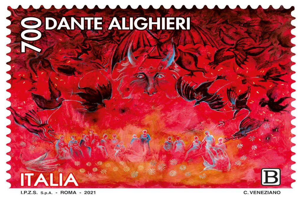 Ispirato a un affresco del Camposanto di Pisa, l’opera è stata richiesta da Poste Italiane, MISE, MEF e Poligrafico e Zecca dello Stato per farne il francobollo dedicato alla “Commedia” di Dante, dal 14 settembre presente negli uffici postali italiani. Si è trattato di un evento di particolare significato, giacché, come ha sottolineato il Ministero dello Sviluppo Economico, a differenza di ogni altro precedente annullo filatelico, è stata scelta un’opera pittorica già preesistente di un autore vivente.