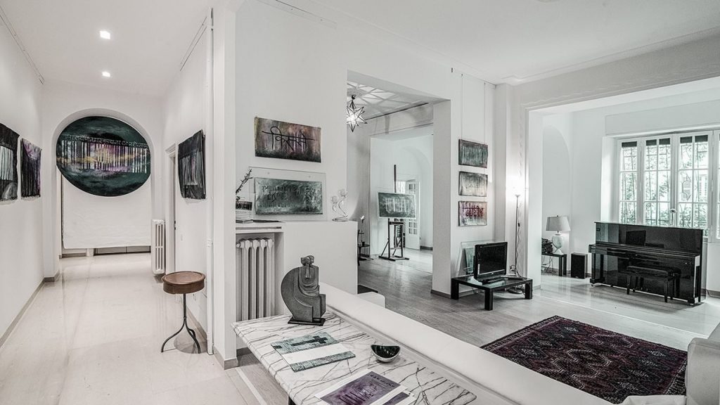 Il palazzo che lo contiene è uno stabile del 1925 di elegante fattura, alle spalle del fiabesco quartiere progettato dal fiorentino Gino Coppedé, di cui risente nella sua elegante architettura. E proprio qui, in via Reno 18A, sarà esposta, per le due giornate di Open House, un’ampia selezione delle opere pittoriche dedicate alla Divina Commedia che, a cura di Francesca Barbi Marinetti, Niccolò Lucarelli e Raffaella Salato, ha rappresentato l’unica mostra di un artista contemporaneo nell’ampio palinsesto varato dal Ministero della Cultura e dal Comitato Dante700.