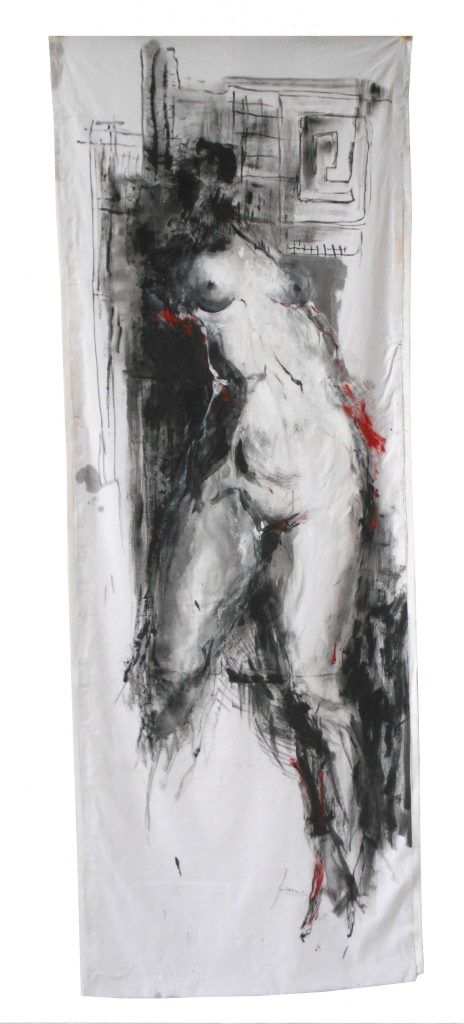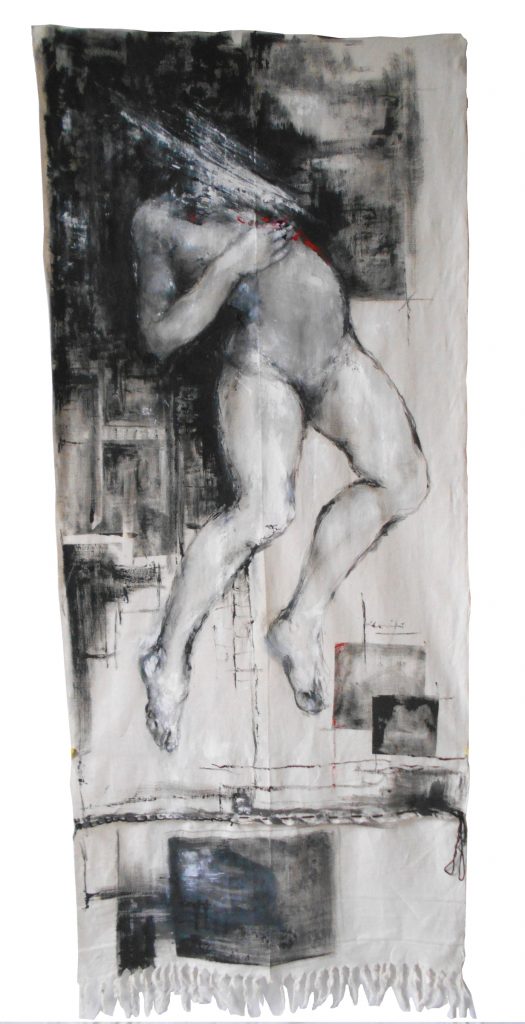 Quasi una trentina le opere in rassegna, sono grandi dipinti in tecnica acrilica su tela libera non intelaiata, ricavata da lenzuola, “antico rifugio simbolico di protezione” vissuto nel lockdown per il Covid-19. Rapido, quasi spatolato, anche il tratto, che ha risentito del clima di tensione e sconcerto. I lavori sono sia esposti a parete, sia messi sotto forma di installazione o a tappeto.