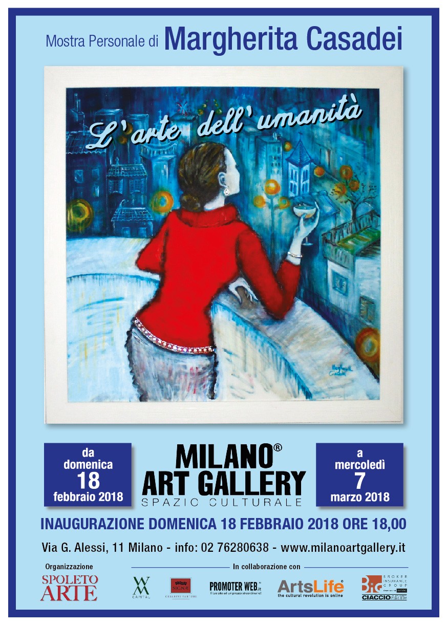 La talentuosa artista Margherita Casadei ha scelto la Milano Art Gallery (in via Alessi 11), storica galleria nel cuore del capoluogo lombardo, conosciuta come luogo di riferimento del Maurizio Costanzo Show, per inaugurare la sua importante mostra dal titolo “L’arte dell’umanità”. L’esposizione verrà organizzata dal manager della cultura Salvo Nugnes e si terrà dal 18 febbraio al 7 marzo 2018, con inaugurazione prevista domenica 18 febbraio alle 18.00.
