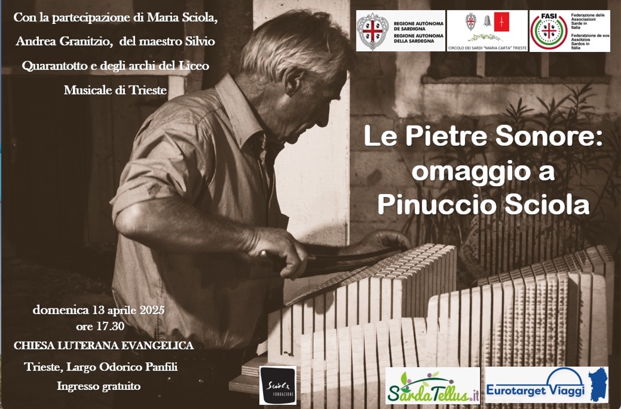 Per la prima volta a Trieste, le "Pietre sonore" di Pinuccio Sciola, verranno viste e ascoltate nella suggestiva cornice della Chiesa Luterana di Trieste ( via Odorico Panfili, 1). Le sculture verranno presentate dalla figlia MAria Sciola, direttrice della Fondazione Sciola e dal musicista Andrea Granitzio, con la partecipazione del maestro Silvio Quarantotto e gli allievi del Liceo Musicale di Trieste.