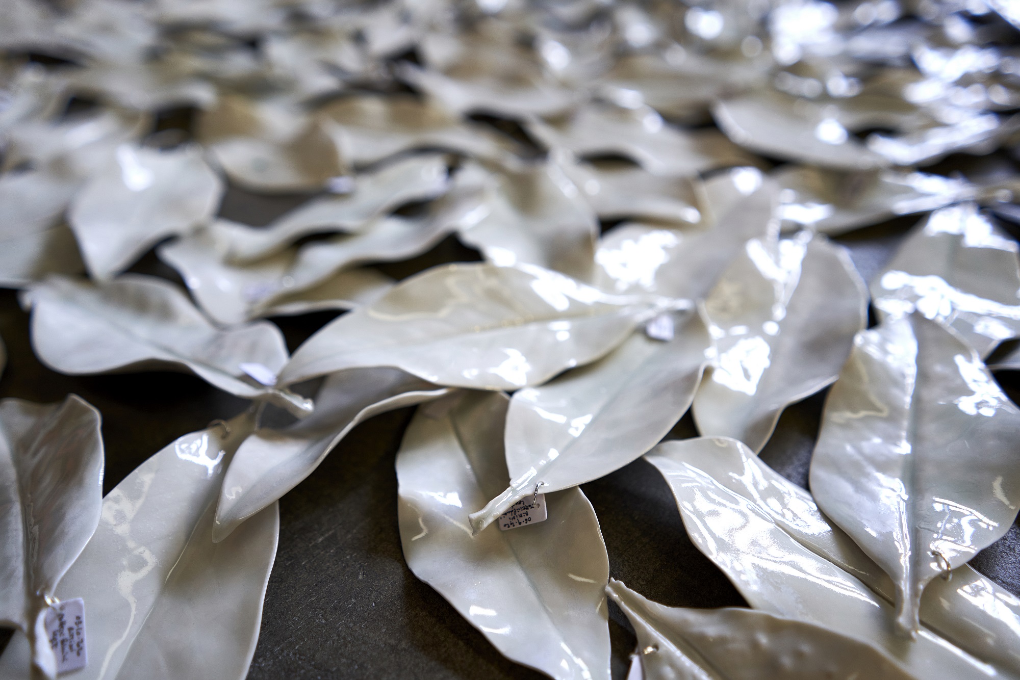 Legit è un’installazione scultorea di oltre mille foglie raccolte, catalogate, riprodotte fedelmente in porcellana e presentate con un cartellino botanico, definita dalla stessa artista “un monumento alla natura, la sindone di un passaggio effimero, che copre l’arco di un anno: attraverso la vita di ogni singola foglia”.
