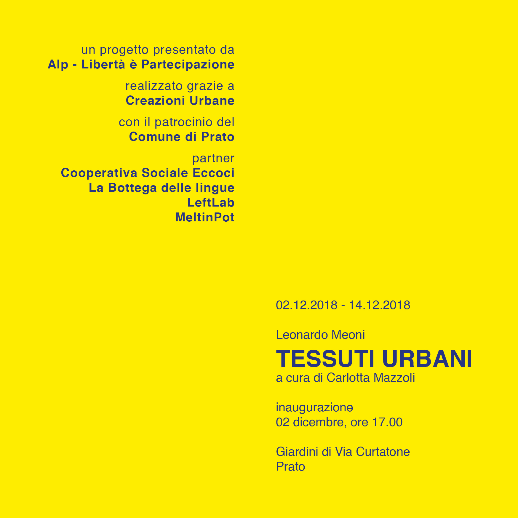 La mostra rientra nel progetto Tessuti Urbani, ideato dall’artista Leonardo Meoni in collaborazione con Alp - Libertà è Partecipazione e il supporto di Creazioni Urbane del Comune di Prato. L’installazione resterà visibile nel giardino fino a venerdì 14 dicembre.