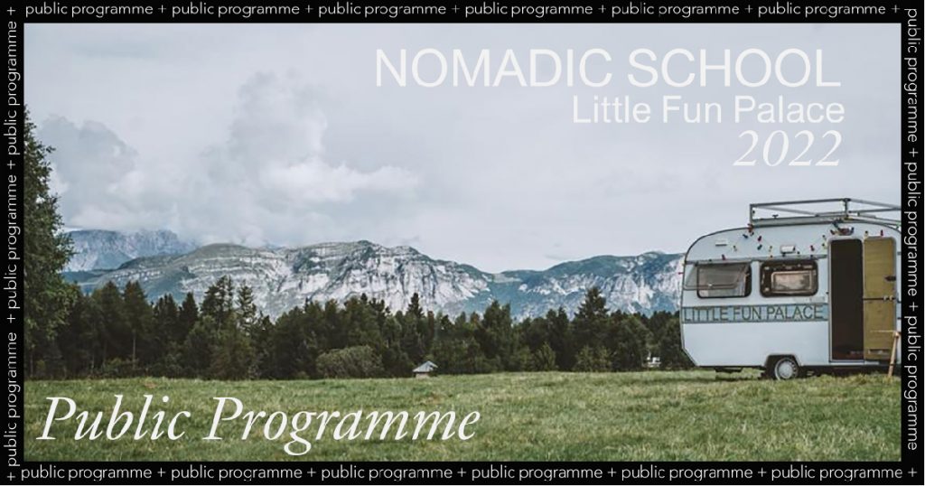 Dal 25 giugno al 3 luglio la roulotte di Little Fun Palace torna ad essere Scuola Nomadica che abita il territorio alpino e s’interroga su come lo spazio produce realtà. Nove giorni di spazio, tempo e conoscenze condivise tra partecipanti e mentori, con alcuni momenti aperti al pubblico che potrà partecipare agli eventi del Public programme. Un tempo insieme nel paesaggio alpino, ospite e attore di Little Fun Palace.