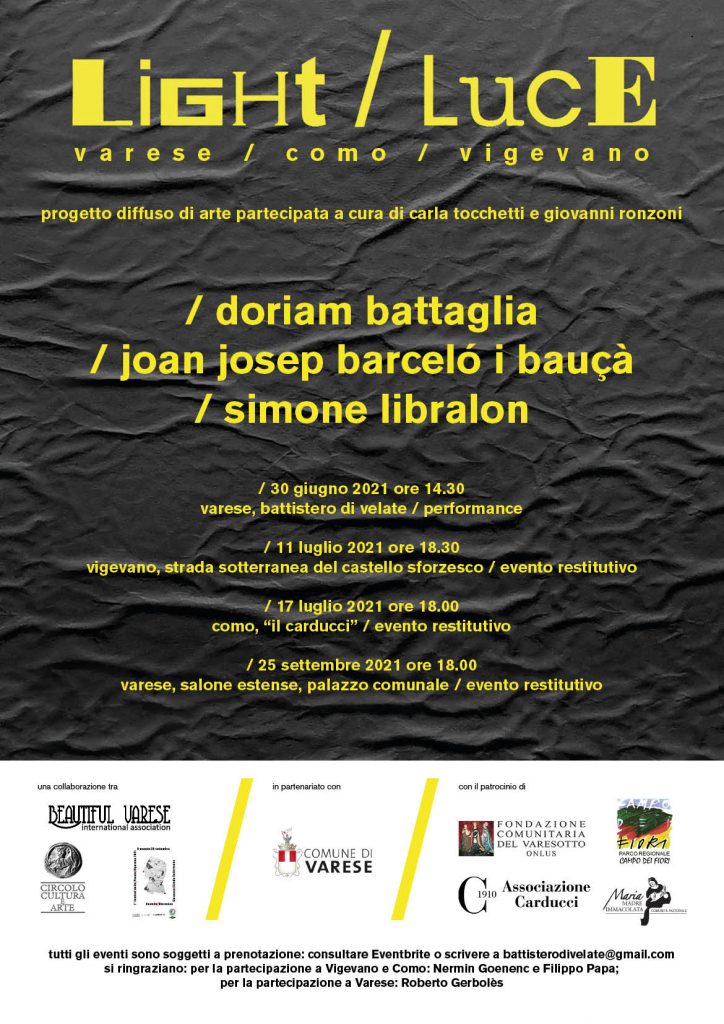 Evento del progetto diffuso di arte partecipata curato da Carla Tocchetti e Giovanni Ronzoni. Tre artisti durante l'ultimo lockdown collaborano da remoto sul tema della luce e producono un evento che viene restituito in presenza in tre città lombarde: Varese, Vigevano, Como. Partecipanti: Joan Josep Barcelo i Bauca (poesia), Doriam Battaglia (arte visuale), Simone Libralon (musica).