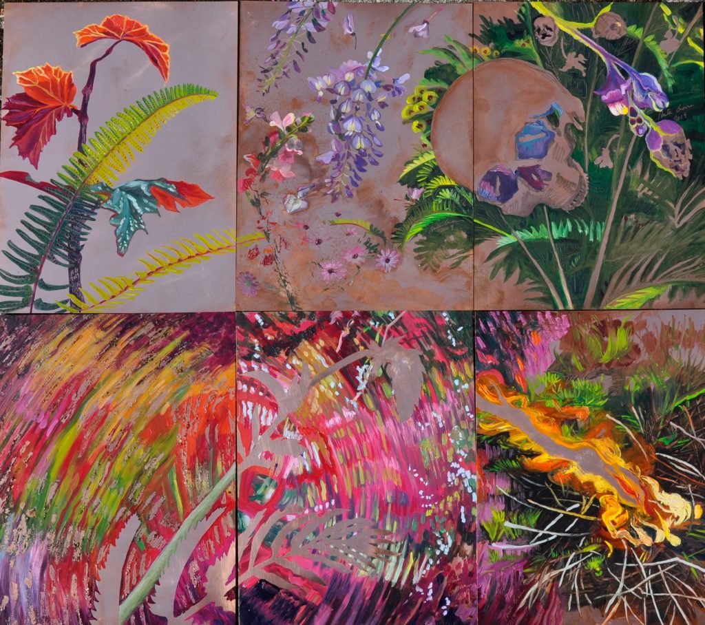 Anita Guerra affronta la sua intima connessione con la sfera naturale presentando un olio su rame: il rame è un materiale che ha la doppia connotazione di essere sia rigido e sia malleabile; è presente nel nostro organismo ed è essenziale per il benessere del nostro corpo, è conduttore di elettricità, si trasforma a contatto con gli altri elementi e si scioglie facilmente. A Cuba, paese di origine dell’artista, il rame viene spesso associato alla ricchezza, ma anche allo sfruttamento del periodo dello schiavismo e al mondo spirituale legato al culto della patrona di Cuba, la Vergine della Carità. Di colore rosa-arancione, il rame ha una luce calda e i colori ad olio scivolano dolcemente sulla superficie scintillante: Anita lo lucida, lo graffia, lo ossida e lo modella. L’opera si impone con la sua materialità ma contemporaneamente la nega in un complesso mondo di illusioni: vuoto o fiamma, paradiso o elemento che sgorga da un ruscello, lascito del passato e attesa del futuro.