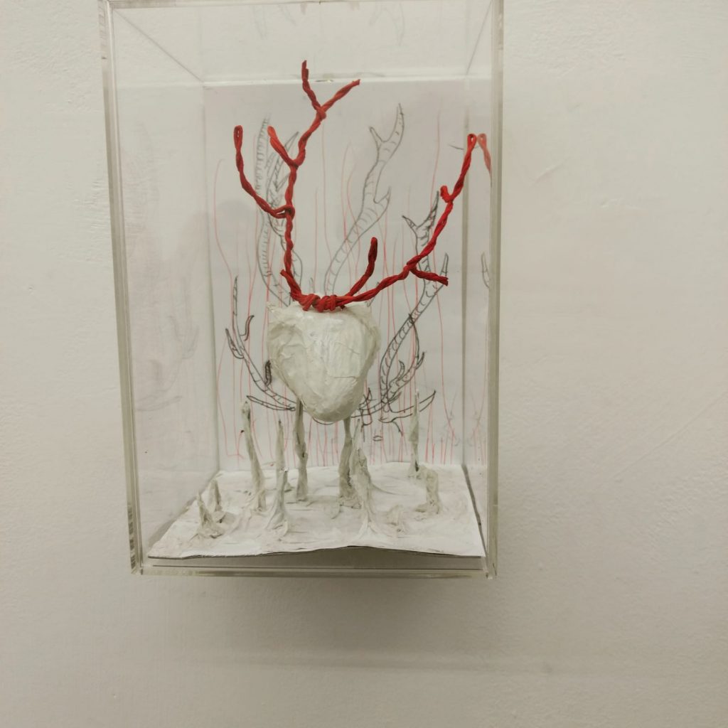 Marina Buening lavora con materiali naturali sempre molto diversi: per questo progetto ha realizzato una mini installazione di scatole trasparenti che prendono forma da strane conchiglie, pungenti e spinose (in tedesco stachelig). Dietro di esse dei disegni realizzati a matita e delle acqueforti a punta secca. L’artista dà vita a dei micro-mondi, metafore delle variegate e molteplici realtà nelle quali ognuno di noi si trova immerso: ogni scatola è una vita, reale e concreta o dello spirito, nella quale la natura si insinua inevitabile e ineluttabile.