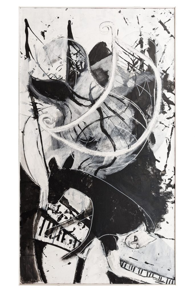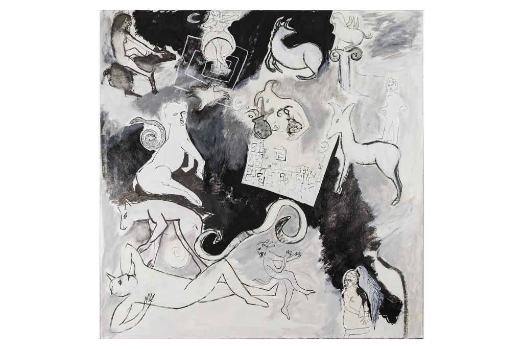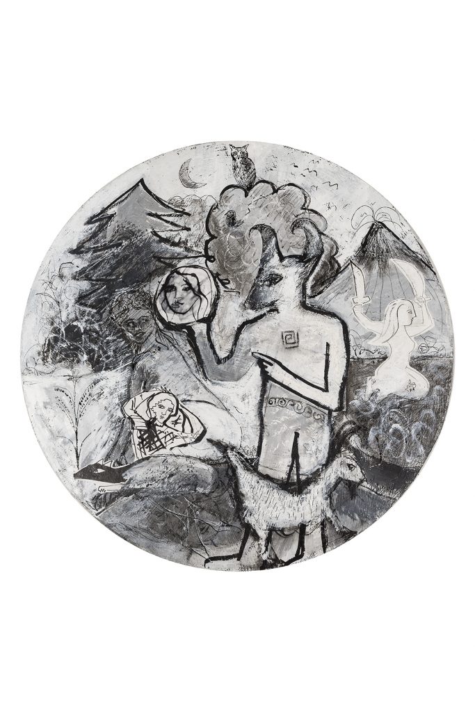Il verso dell'Iliade che dà il titolo alla mostra - Scendeva simile alla notte - e che nel poema omerico è riferito al dio Apollo, è qui rivolto anche alla figura di Dioniso, dio greco del vino e dell'ebbrezza, archetipo della vita indistruttibile secondo la celebre definizione di Károly Kérenyi.
