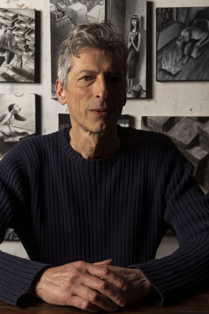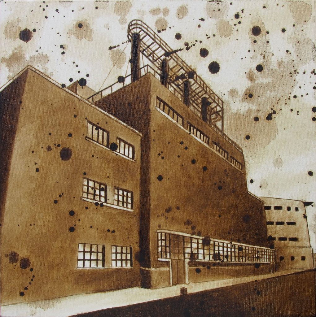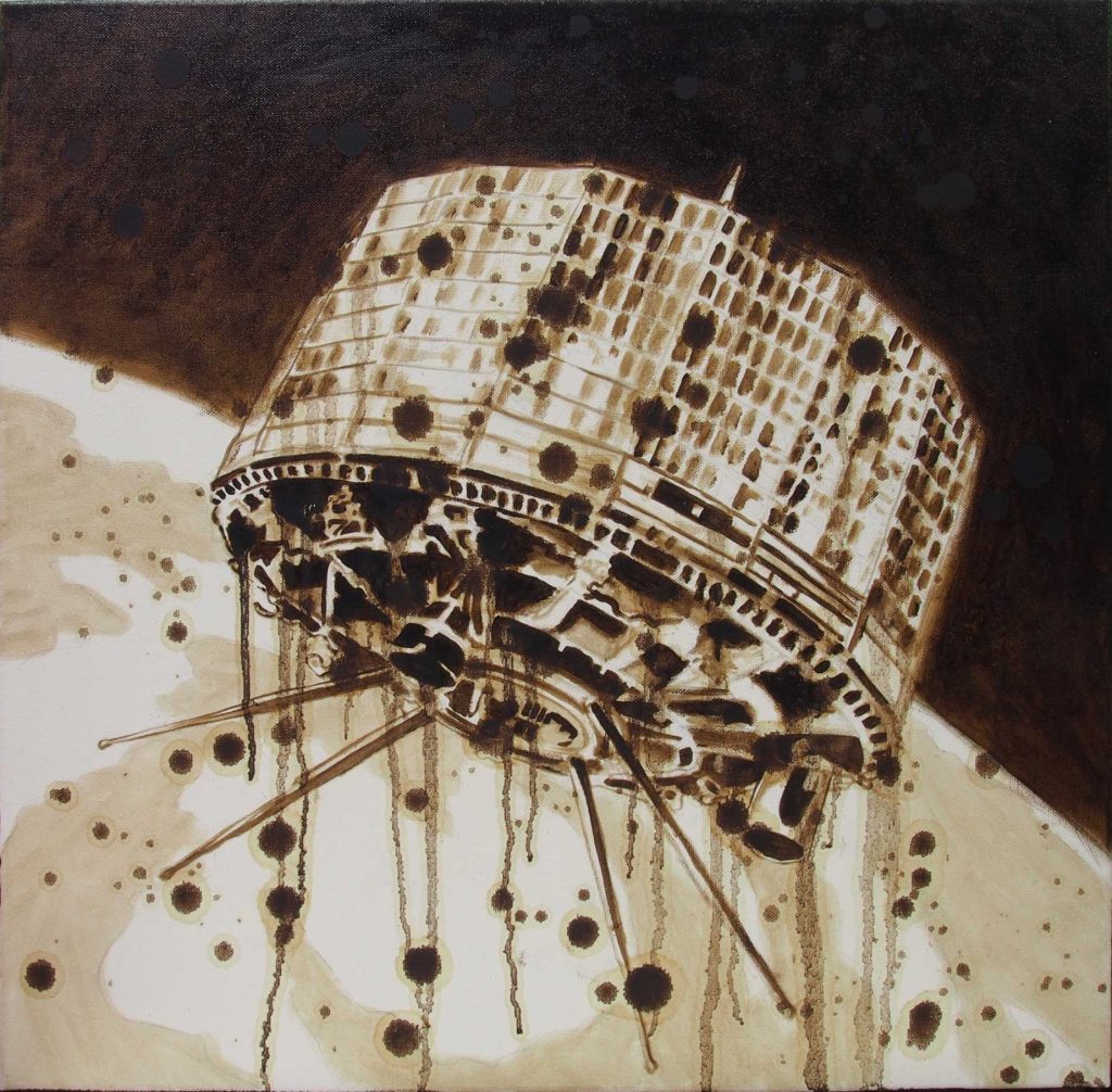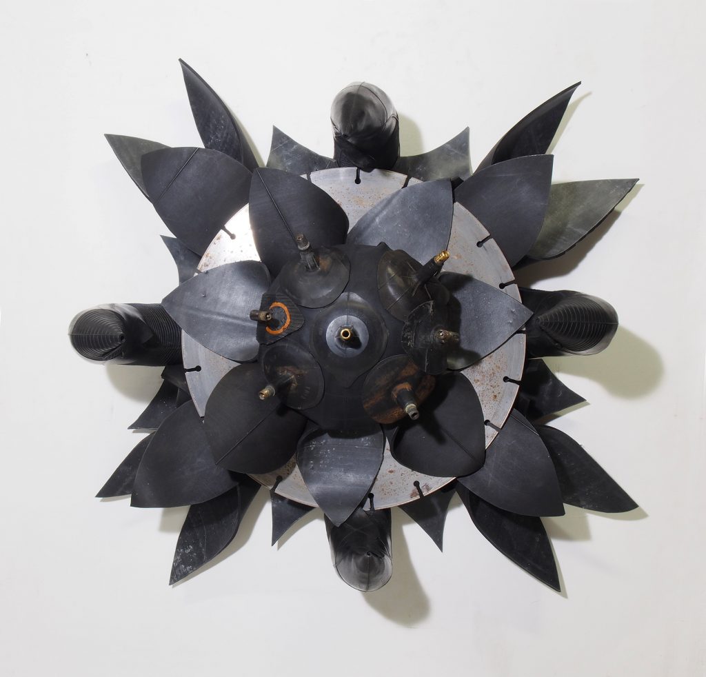 Dalla terra alla luna radicalizza lo sguardo di Luca Matti sulla città. Non più e non solo la selva di edifici irrompe dalle sue tele; ora l’intero ecosistema appare aggredito dalla presenza umana. Una natura mutata, ormai divenuta sintetica, emerge rigogliosa dalle giungle dipinte a bitume o scolpite nelle camere d’aria.