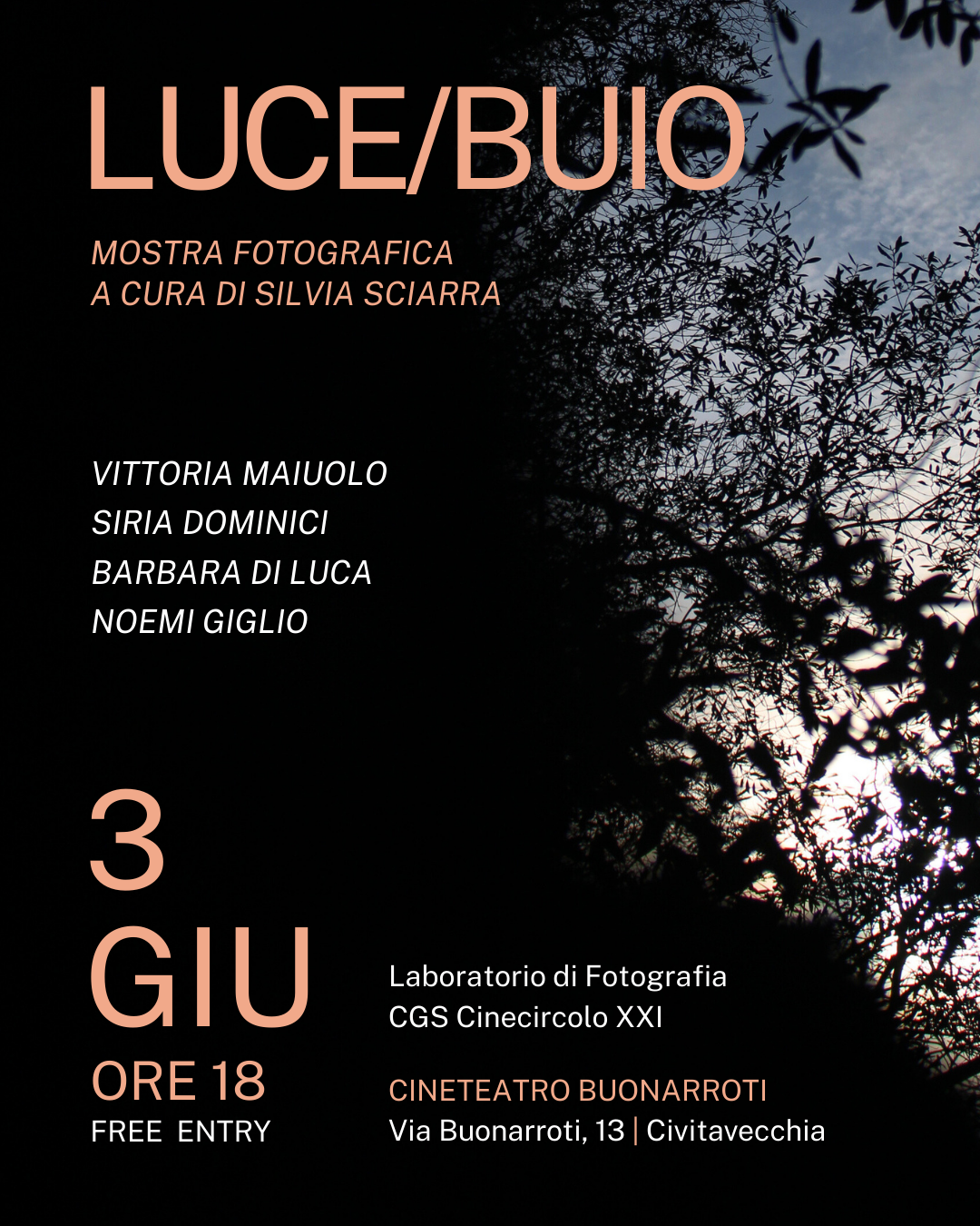 L’Associazione CGS Cinecircolo XXI e il Cineteatro Buonarroti sono lieti di invitarvi alla mostra fotografica “Luce/Buio”, curata da Silvia Sciarra e realizzata come momento conclusivo del Laboratorio di Fotografia.