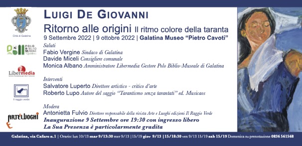 Si intitola Ritorno alle origini: il ritmo colore della taranta e si inaugurerà il 9 settembre (ore 19:30 con ingresso libero) al Museo Civico “Pietro Cavoti” la nuova personale di Luigi De Giovanni curata dal direttore del Museo e critico d’arte Salvatore Luperto che firma anche l’allestimento con Anna Panareo. Dopo i saluti del Sindaco Fabio Vergine, del consigliere comunale Davide Miceli e di Monica Albano gestore del Polo BiblioMuseale di Galatina e amministratore di Libermedia, la serata coniugherà arte e letteratura grazie agli interventi di Salvatore Luperto curatore della mostra e di Roberto Lupo autore del saggio “Tarantismo senza tarantati” (edito da Musicaos). Gli interventi saranno moderati dalla giornalista Antonietta Fulvio direttore responsabile della rivista Arte e Luoghi edita da Il Raggio Verde che organizza l’evento espositivo con il Patrocinio del Museo Civico “Pietro Cavoti” e del Comune di Galatina.