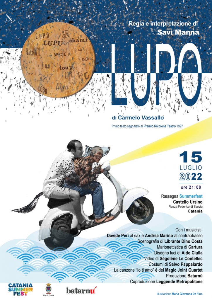 Venerdì 15 luglio alle ore 21, all’interno della corte del Castello Ursino di Catania, per la rassegna “Catania Summer Fest 2022” andrà in scena lo spettacolo teatrale Lupo, scritto da Carmelo Vassallo, nella singolare messa in scena di Savì Manna, che ne è regista ed unico interprete, e che dona così nuova vita allo spettacolo che nel 2007 lo vedeva in scena co-protagonista al fianco del drammaturgo catanese prematuramente scomparso.