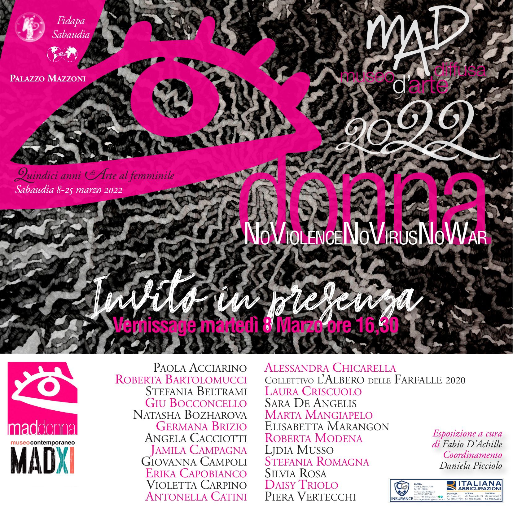 Pittura, la Fotografia, la Scultura, la VideoArte, il Disegno, il Collage, la Manipolazione e l’Assemblaggio di materiali fino al Libro d’artista. Il tema di quest’anno è il biennio di Pandemia che ha portato le autrici dentro e fuori di sé stesse con il leitmotiv “No Violence No Virus No War” visto che si svolge nel mentre di un un conflitto quasi mondiale! L’iniziativa è sostenuta dalla FIDAPA di Sabaudia e dal Soroptimist International Club di Latina e dal Museo Contemporaneo MadXI.