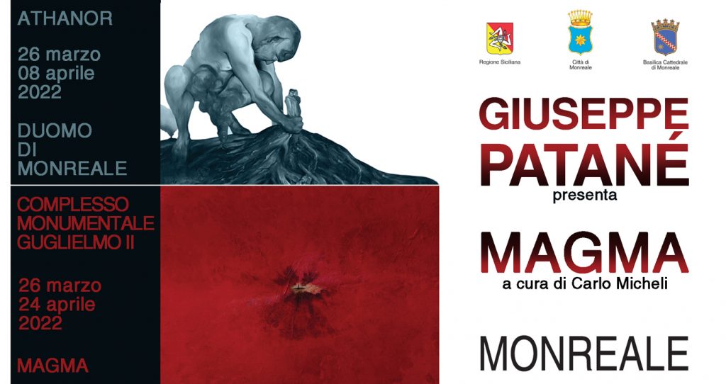 Dal 26 marzo al 24 aprile il Duomo di Monreale e il Museo Civico di Palazzo Guglielmo II, ospitano la personale di Giuseppe Patanè dal titolo Magma. Esposizione curata da Carlo Micheli, col patrocinio della Regione Sicilia, del Comune di Monreale e della Curia Arcivescovile di Monreale.