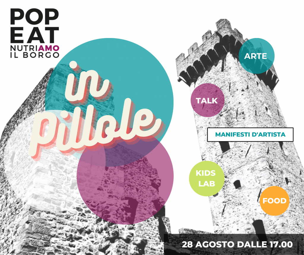 Sabato 28 agosto a Castelnuovo Magra in provincia di La Spezia si svolgerà Pop-Eat in Pillole, edizione ripensata del festival d’arte e promozione territoriale Pop-Eat|Nutriamo nato nel 2006. La nuova versione dell’evento che, data la situazione emergenziale ancora in corso non potrà svolgersi nella modalità tradizionale, vuole portare la cultura al di fuori dei canonici circuiti di settore dedicati all’arte contemporanea. L’idea del progetto è quella di offrire una serie di “pillole” d’arte attraverso le quali arrivare ad un pubblico ampio ed eterogeneo.