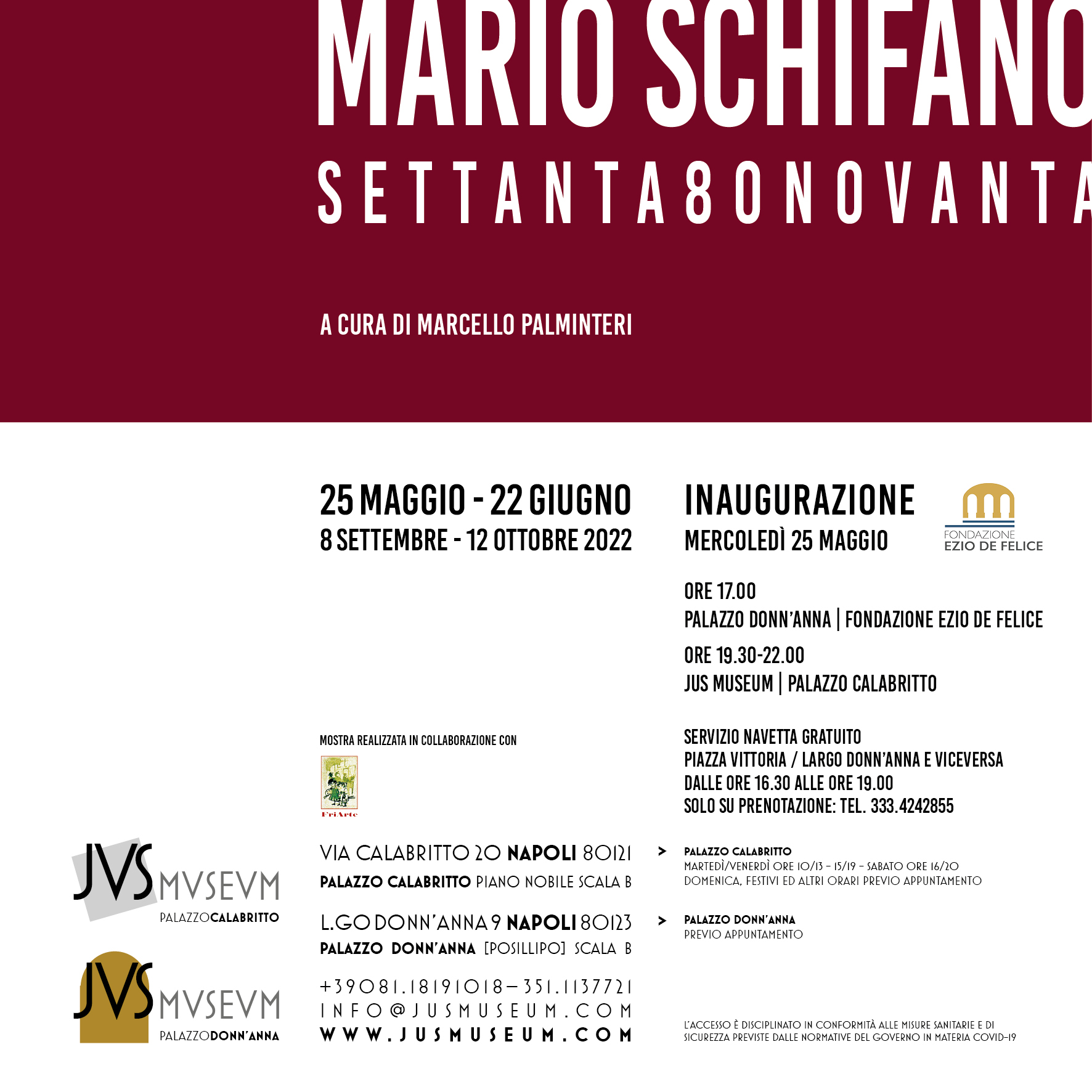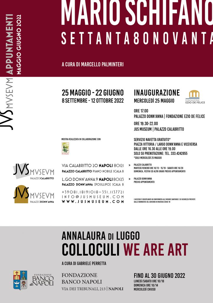 Mercoledì 25 giugno dalle 17.00 alle 22.00 (nelle due sedi di JUS MUSEUM: Palazzo Calabritto e Palazzo Donn'Anna) si inaugura la mostra “MARIO SCHIFANO. SETTANTA80NOVANTA”, a cura di Marcello Palminteri. In esposizione, venti opere realizzate da Mario Schifano tra gli anni Settanta e gli anni Novanta, provenienti da collezioni private.
