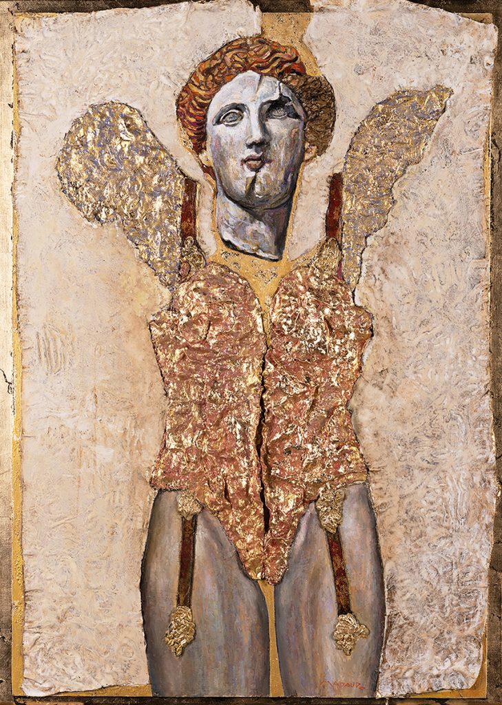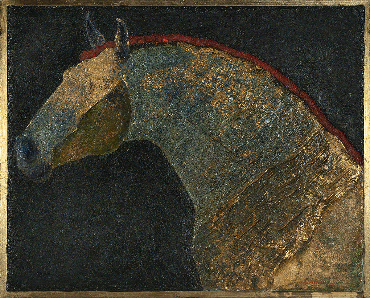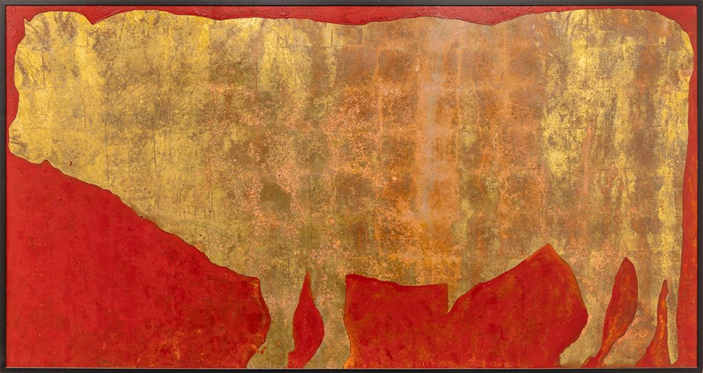 L’uso della foglia d’oro, in particolare, non ha funzione simbolica, attraversa la superficie senza dominarla, modulando la luce, spezzandola, catturandone il fondo.