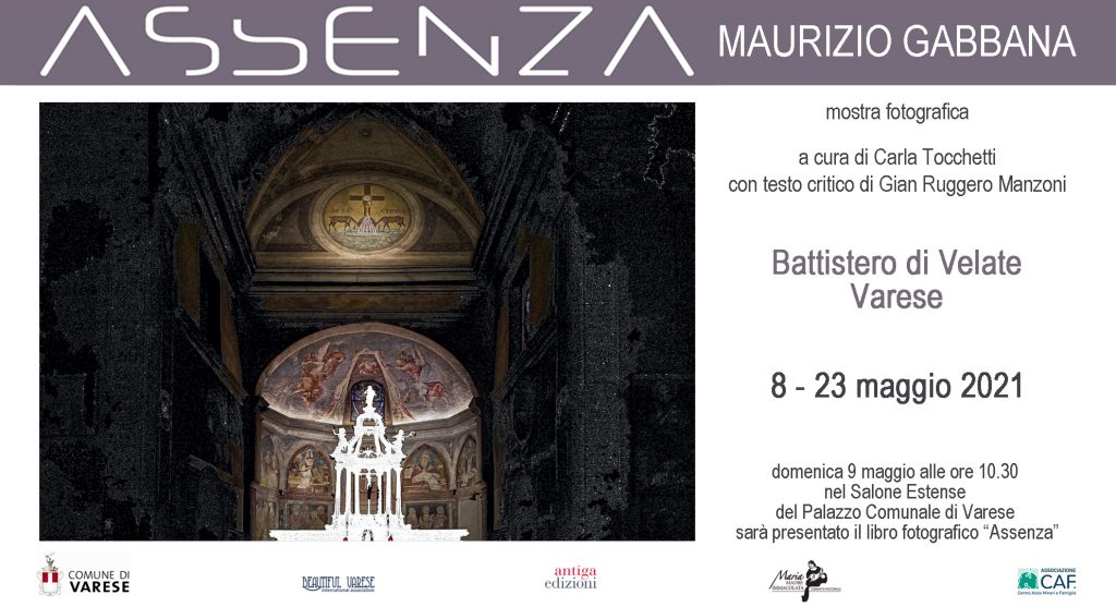 Sabato 8 maggio inaugura “Assenza”, la mostra fotografica di Maurizio Gabbana al Battistero di Velate (VA) curata da Carla Tocchetti. Domenica 9 maggio alle10.30, nel Salone Estense del Palazzo Comunale di Varese, verrà presentato il libro con le foto dell’artista e il testo di Gian Ruggero Manzoni.
