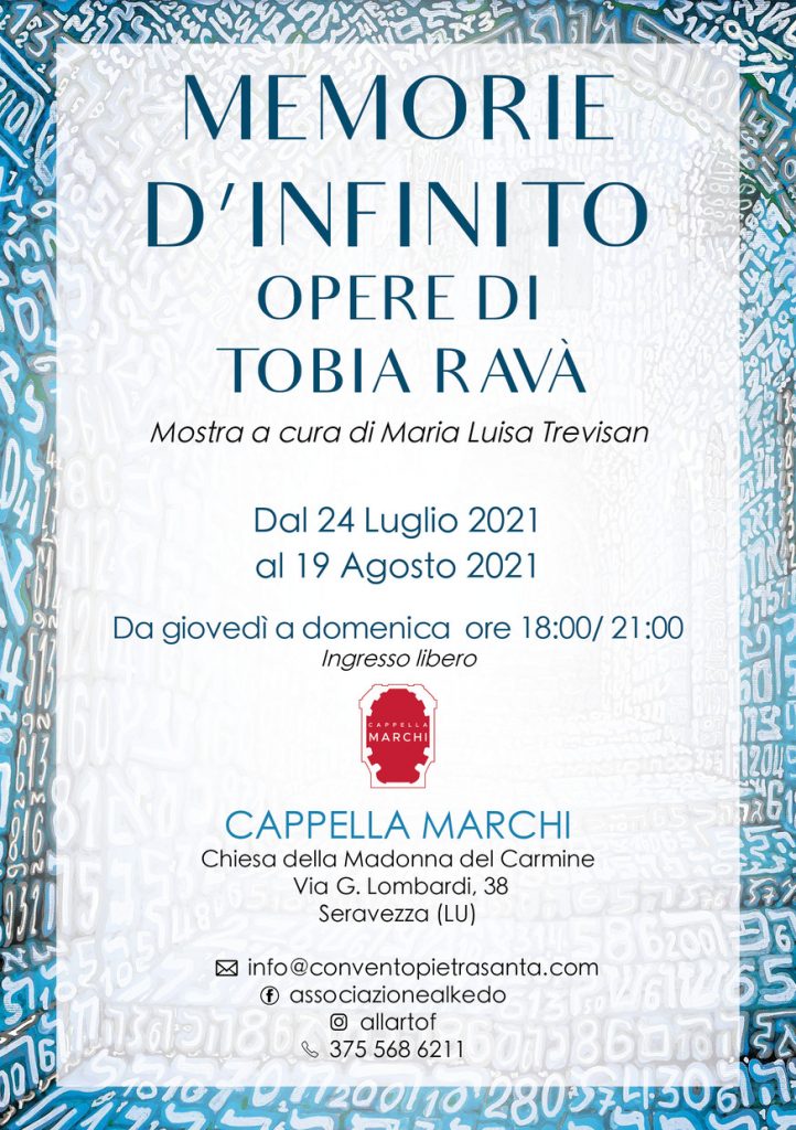 Sabato 24 luglio alle ore 18 s’inaugura la mostra "Memorie d’Infinito. Opere di Tobia Ravà", a cura di Maria Luisa Trevisan, allestita presso il nuovo spazio Cappella Marchi gestito da associazione Alkedo presso la Chiesa della Madonna del Carmine di Serravezza(LU).