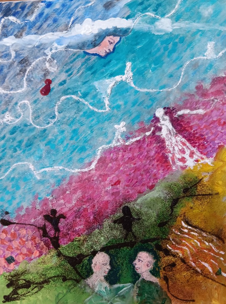 La visione pittorica di Focanti è l’apertura a un mondo onirico in cui il dato fenomenico si fonde con quello simbolico. L’approssimarsi delle forme e dei colori alla riconoscibilità della natura fa da contrasto ad elementi spuri che appaiono e sostano nella tela: in particolare il volto diventa sineddoche del corpo, una parte per il tutto, un profilo radicato nello spazio che lo circonda in una metamorfosi panteistica dell’umano.