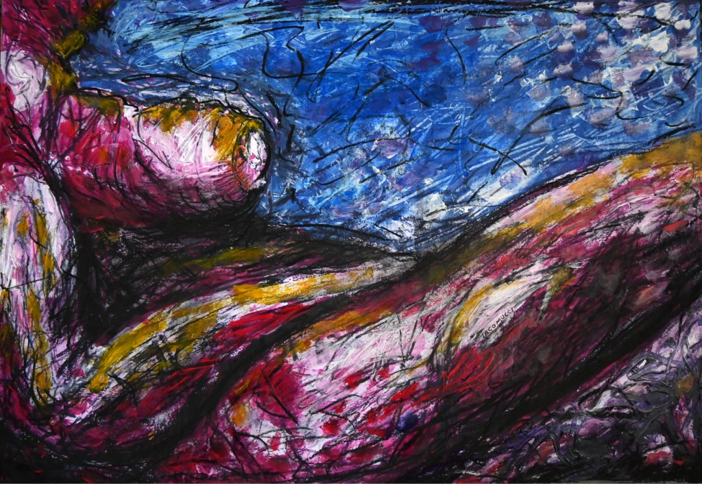 La gestualità potente e saggia di Iacomucci si contrappone alla pausata e serena conduzione della Focanti. La mano decisa e graffiante di Iacomucci definisce il corpo femminile come la ricomposizione di un caos primordiale, il cui perno è il segno che, dopo aver definito il disegno sottostante alla pittura, decostruisce la figura, ribattezzando con il colore un nuovo cosmos metamorfizzato: è anatomia del negativo che opera coprendo il segno preparatorio, affinché affiori la natura materica del corpo-gestualità.