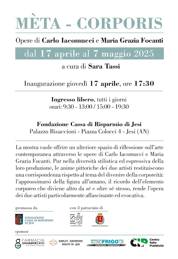 La mostra curata da Sara Tassi (vicepresidente Fondazione CRJ) vuole offrire un ulteriore spazio di riflessione sull'arte contemporanea attraverso le opere di Carlo Iacomucci e Maria Grazia Focanti. Pur nella diversità stilistica ed espressiva della loro produzione, le anime pittoriche dei due artisti restituiscono una corrispondenza rispetto al tema del divenire della corporeità