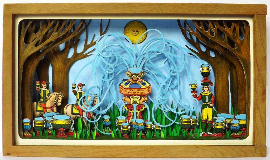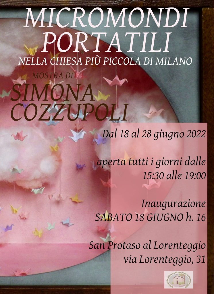 I micromondi fiabeschi di Simona Cozzupoli trasformano la chiesetta medievale di San Protaso al Lorenteggio in una Wunderkammer contemporanea, dove meravigliarsi osservando tutti i minuti particolari dei diorami esposti. Piccole teche di legno, o cornici dotate di una certa profondità, contengono mondi onirici tridimensionali i cui protagonisti sono le figure delle carte da gioco ritagliate e ricontestualizzate in giardini fiabeschi, illustrazioni di farfalle infilzate da veri spilli e catalogate secondo la vera nomenclatura scientifica, pesci di carta che riproducono la varietà caleidoscopica della fauna marina e oggetti vari che compongono "nature morte contemplative" monocrome oppure "rebus oggettuali" che coinvolgono lo spettatore in un gioco ermeneutico.