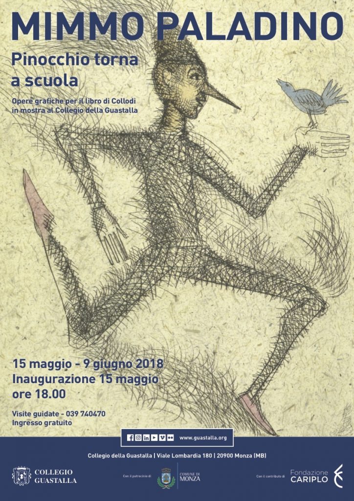 Mimmo Paladino è uno dei più grandi artisti italiani viventi, conosciuto in tutto il mondo per la sua opera di pittore e scultore. Meno conosciuta, forse, è la sua attività di grafica, peraltro molto significativa e documentata nella recente esposizione lecchese Grandi Cicli Incisori 1986-2012. Fino al 9 giugno nel Salone d'Onore, il Collegio della Guastalla di Monza, scuola paritaria fondata nel 1557, esporrà 26 opere grafiche dal titolo “Mimmo Paladino - Pinocchio torna a scuola”. Nella tradizione del “libro d’artista” Paladino interpreta il Pinocchio di Collodi secondo il suo stile immaginifico e colorato, sperimentando una grafica raffinata e al tempo stesso semplice, adeguata al libro più noto di letteratura per l’infanzia. Non è solo illustrazione, ma un altro testo, che affianca il testo letterario e racconta con le immagini piccole storie dentro la grande storia della narrazione di Collodi.