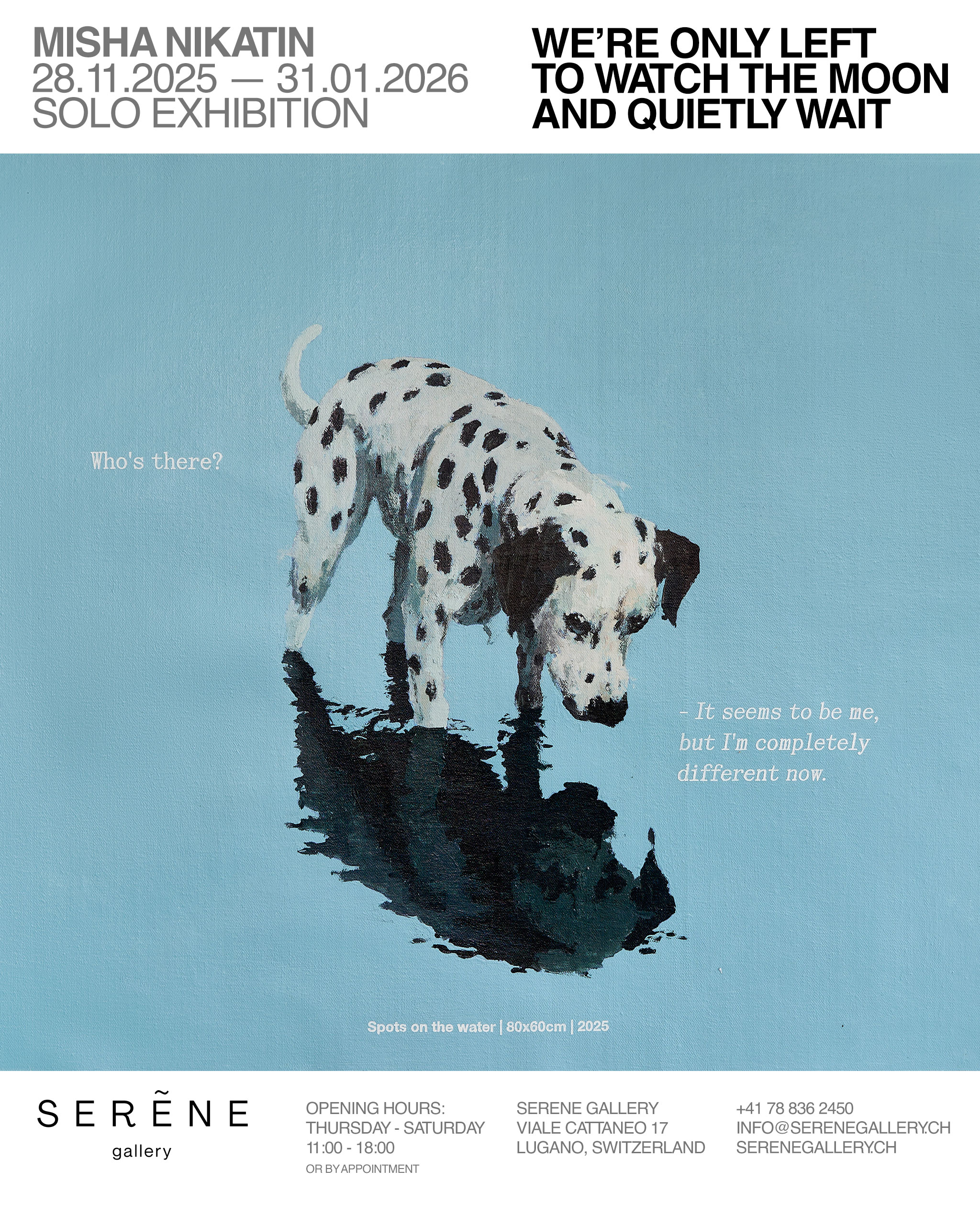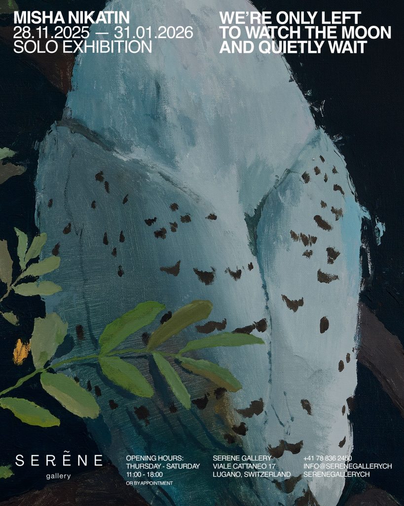 La Serene Gallery di Lugano presenta We’re only left to Watch the Moon and quietly wait, la prima mostra personale in Svizzera e in Europa dell’artista russo Misha Nikatin, figura emergente della nuova scena contemporanea e attualmente artista residente presso il Garage Museum of Contemporary Art di Mosca. La mostra riunisce diciotto opere recenti, realizzate appositamente per questo progetto, che segnano un’evoluzione nella ricerca dell’artista, da anni focalizzata sul rapporto tra immagine, parola e percezione.