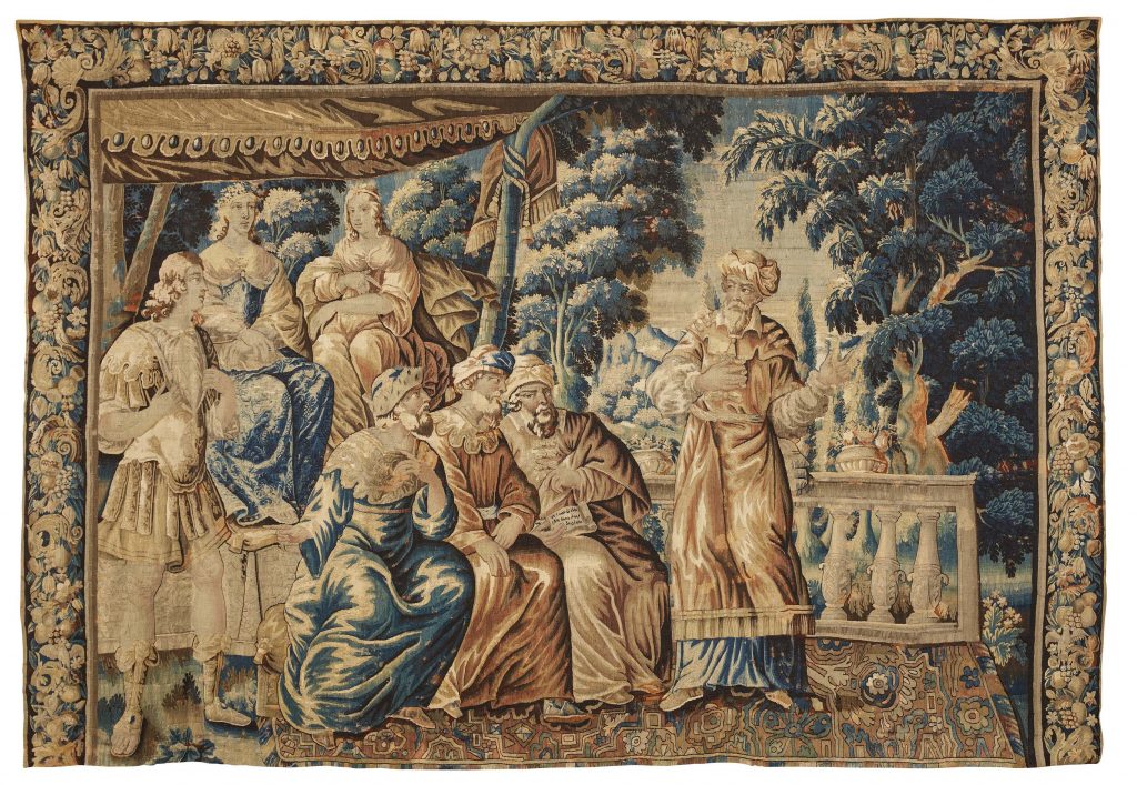 Chiudiamo questo breve estratto del catalogo con un grande ARAZZO di Aubusson tessuto in lana e seta tra il 1650 e il 1660 a raffigurare “Mélinte accusa Dioclès davanti ai giudici di Siracusa”, per il quale sono richiesti 5.500/7.500 euro. La scena è una dalla serie dell’Ariane, romanzo di Jean Desmarets de Saint-Sarlin che nell’edizione del 1638 era corredato da diciotto incisioni di Abraham Bosse dalle quali derivarono diversi cicli di cartoni per arazzi, i primi realizzati nelle manifatture parigine, poi in quelle di Aubusson.