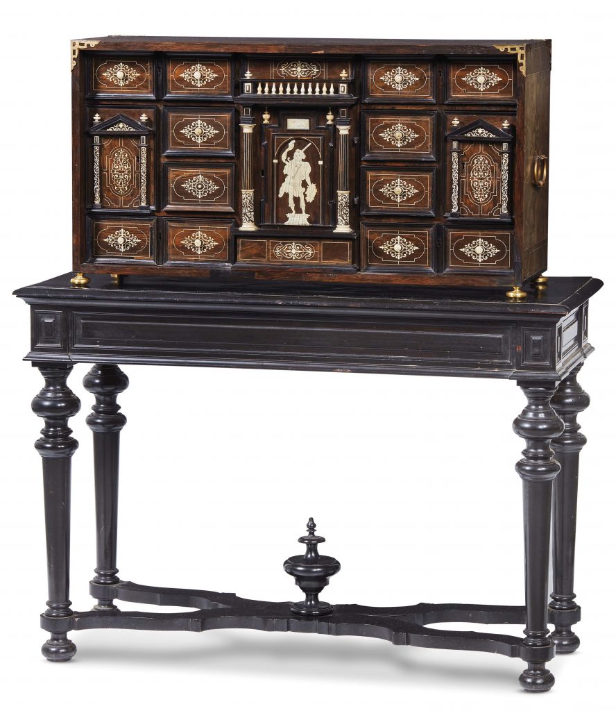 Tutti i lotti inseriti in catalogo hanno delle peculiarità per cui sono stati selezionati, alcuni hanno quel qualcosa in più che li rende particolarmente interessanti, ne fa dei protagonisti come la rara COPPIA DI STIPI lastronati in ebano e palissandro con decori e intarsi in osso, lavorati in modo tale che il disegno dell’uno risulti il negativo dell’altro. Realizzati a Napoli agli inizi del XVII secolo, e inseriti in catalogo con la stima di 12.000/18.000 euro, gli arredi sono interessante testimonianza di una tipologia di arredo diffusissima nelle raccolte principesche di tutta Europa dalla seconda metà del Cinquecento a tutto il secolo successivo, la cui produzione trova il proprio epicentro nella città partenopea quando il Regno delle due Sicilie era un vicereame degli Asburgo di Spagna.