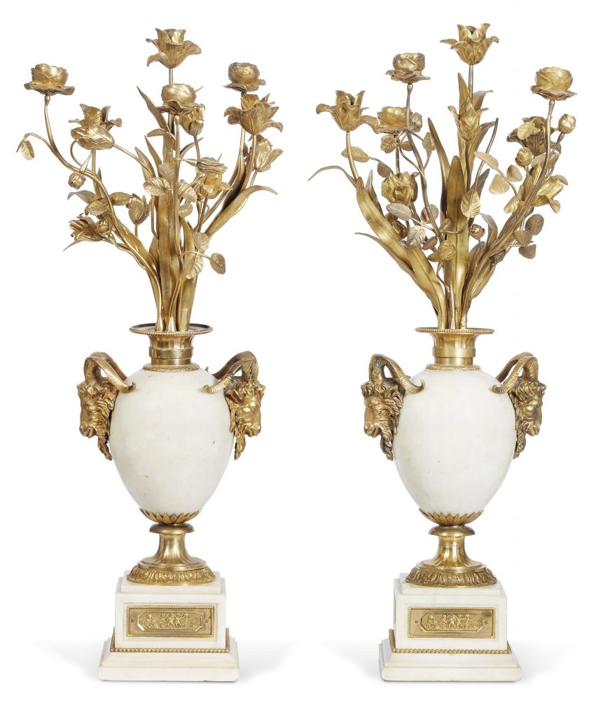 All’Ottocento francese risale anche la COPPIA DI FLAMBEAUX con corpo e base in marmo bianco, ornati da elementi in bronzo dorato: placchette e perlinature alla base, teste d’ariete al corpo dal quale partono rami fioriti; la richiesta è di 1.500/2.500 euro.