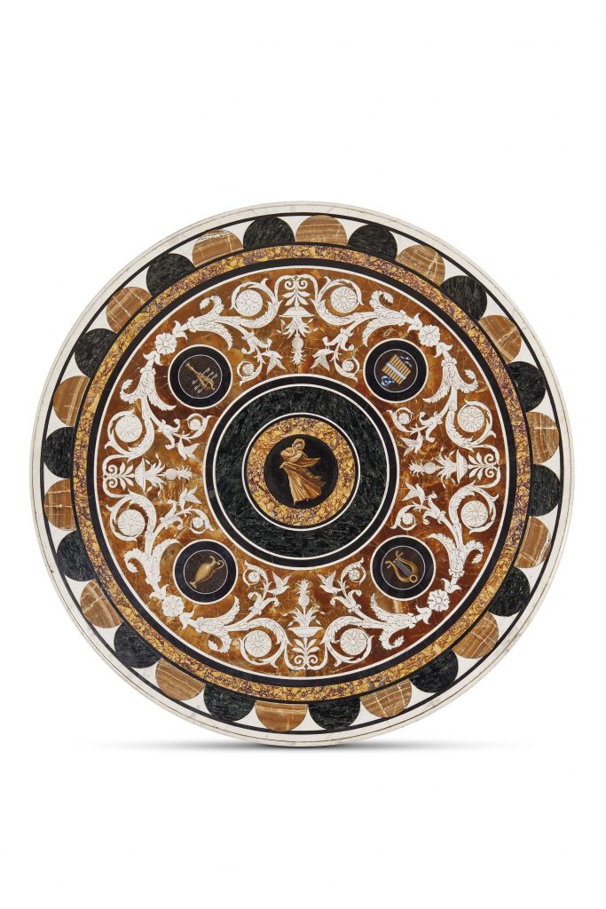 Introduciamo la sezione di International Fine Art con un oggetto d’arte che ha uno stretto legame anche con il nostro Paese essendo stato realizzato a Parigi tra il 1815-20 dal mosaicista romano Francesco Belloni. Si tratta di un PIANO circolare in marmo e micromosaico, dall’esterno al centro si susseguono un bordo di motivi a demilune, cornici, un motivo a ramage bianchi su fondo di alabastro che incorniciano medaglioni a soggetto classico in micromosaico, la cui stima è di 12.000/18.000 euro. Molteplici sono le caratteristiche che avvicinano in modo evidente questo splendido piano a un altro arredo del Belloni custodito al Muosée du Louvre: il Gueridon d’Hartwell realizzato nel 1817.