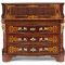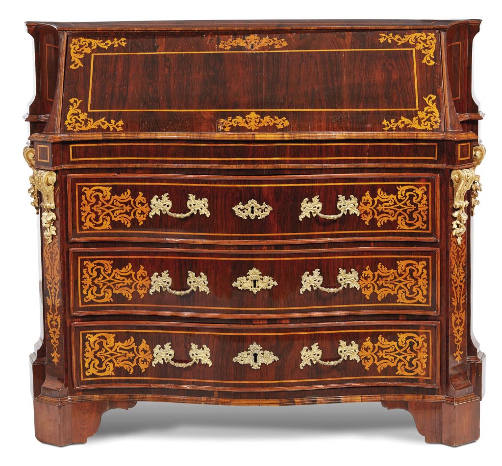 E siciliano è il marmo diaspro con cui è realizzato il piano, profilato in marmo giallo, di una bella CONSOLE realizzata a Roma alla fine del XVIII secolo, la cui valutazione è di 3.000/5.000 euro. In perfetto stile dell’epoca la console è in legno dorato, ha decori di girali fogliate che incorniciano un volto di Medusa, gambe scanalate, poi foglie d’acanto e cornicette a foglie d’acqua. Restiamo a Roma nel XVIII secolo con una RIBALTA lastronata in palissandro, intarsiata in acero con motivi di ramages sui cassetti e nelle lesene angolari, che ha una valutazione di 4.000/6.000 euro, mentre è di 30.000/50.000 euro la richiesta per un importante BUREAU-TRUMEAU realizzato a Roma nel primo quarto del XVIII secolo. L’arredo è lastronato in palissandro con profilature in legno ebanizzato e applicazioni in bronzo dorato; il corpo inferiore è leggermente mosso con scarabattolo a giorno e cassettini, quello superiore ha due ante a specchio.