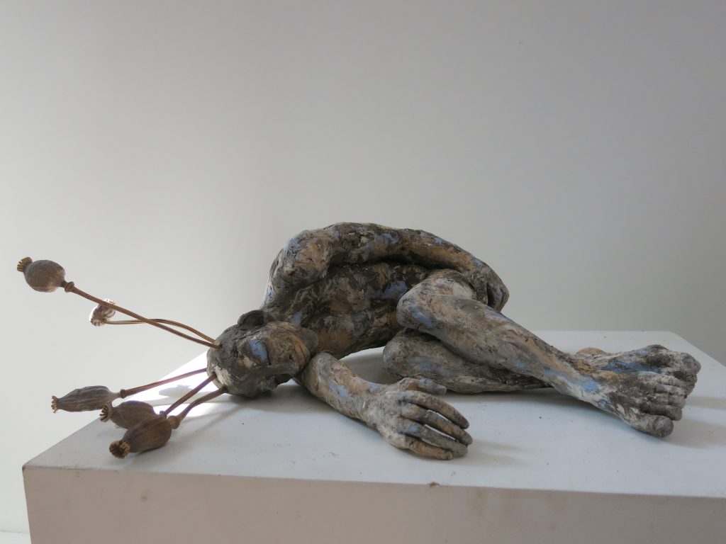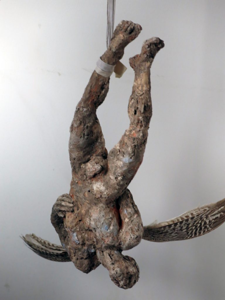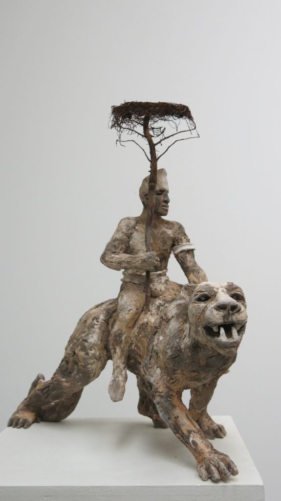 su lunghi steli di metallo, altri frammenti di corpi esplodono in un'eruzione di vegetazione disidratata. L'acqua non c'è più. C'è l'argilla, fusa con ossidi, cobalto-cromo, ferro e caolino, che cristallizandosi ingloba piume, corna di animali ed elementi organici. E' il mondo metamorfico e arcaico che non distingue specie, generi e razze. E' il mondo dei fauni fangosi che si uniscono a corpi silvestri in una vegetazione umida di muschi e palude. E' il mondo perduto nel mito, ma un mito di terra e roccia, espressione di un mondo molto più carnale e palpitante di quello reale, contemporaneo, astratto e digitale.