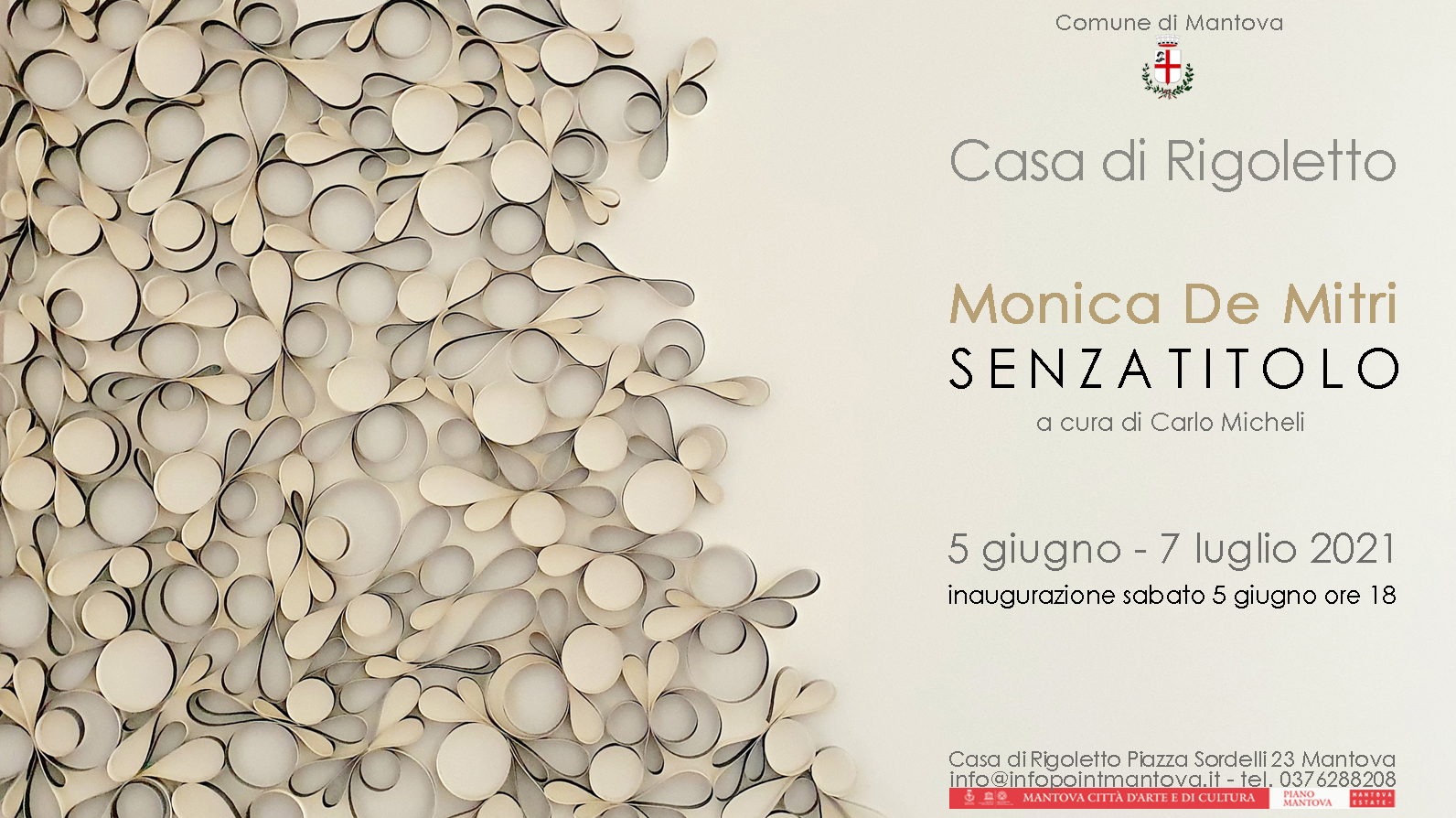 “Senzatitolo”, mostra personale di Monica De Mitri, inaugurerà sabato 5 giugno alle 18 presso la Casa di Rigoletto a Mantova. La mostra, a cura di Carlo Micheli, consta di una trentina di lavori in cui la carta da supporto tradizionale diviene materia. Aperta tutti i giorni (9-18) fino al 7 luglio.