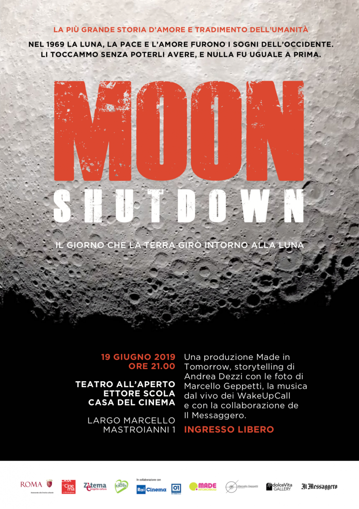 Il 19 giugno, presso la Casa del Cinema di Roma, verrà presentato lo spettacolo “MOON SHUTDOWN, il giorno che la Terra girò intorno alla Luna”. La rappresentazione nasce in occasione dei 50 anni dello sbarco sulla luna, che avvenne il 20 luglio 1969. Nel corso della serata si alterneranno i racconti di Andrea Dezzi, la proiezione di fotografie inedite di Marcello Geppetti, la musica dal vivo della band romana WakeUpCall e, grazie alla collaborazione con Il Messaggero, le prime pagine del quotidiano con gli eventi più importanti del periodo.