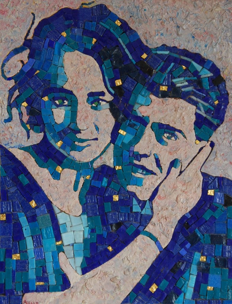 Questa mostra ci permette di scoprire un altro versante creativo, un lato intimo della pittura di Aiello, uno spazio che va oltre il mosaico per attraversare differenti spazi espressivi, un lungo ciclo di paesaggi anticipati da un’opera come La Rocchetta del 1999 che fonde pittura a olio e mosaico nella rappresentazione di un luogo e di un paesaggio cari all’artista, un quadro che apre simbolicamente un nuovo capitolo nella sua opera che arriva fino a quadri recentissimi.