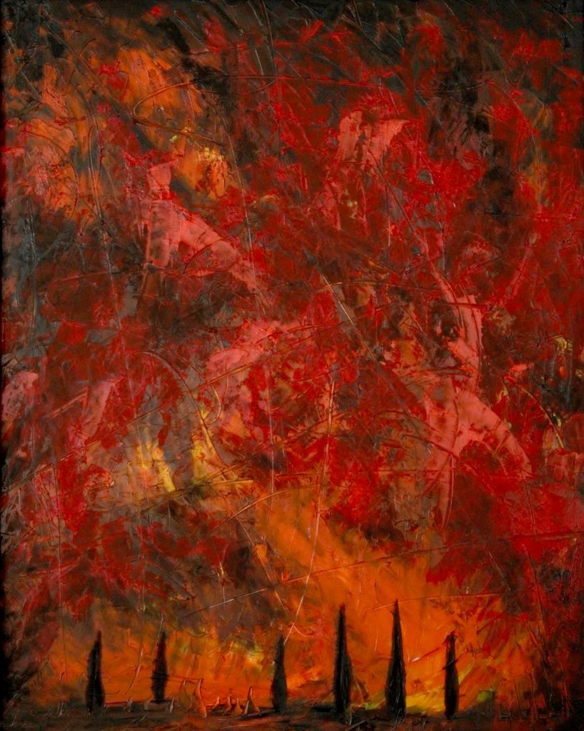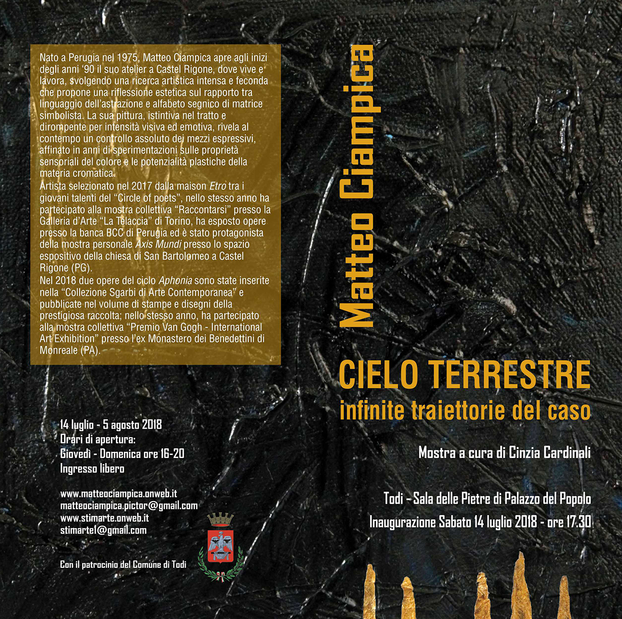L’esposizione propone una quarantina di opere, espressione della ricerca e delle sperimentazioni incessanti condotte nell’ultimo decennio dall’autore umbro, da considerare tra i più interessanti e fecondi del panorama artistico emergente per la sua capacità di trasfigurare echi e suggestioni della tradizione pittorica e del retaggio estetico di passate stagioni in un linguaggio formale autonomo, originale, svincolato da scuole o correnti del nostro tempo, ma profondamente radicato nella contemporaneità. Nel titolo della mostra sono condensati tutti i nodi tematici centrali nella riflessione esistenziale dell’artista, dal dualismo cosmico celeste-terrestre alla poetica del caso e delle sue infinite traiettorie, che si dispiegano in un ciclo pittorico di grande respiro e potenza visiva. Gli scenari rappresentati, del tutto privi di oggetti artificiali, di episodi di carattere narrativo e scevri da qualunque finalità descrittiva, si connotano essenzialmente come paesaggi interiori intrisi di una forte carica simbolica. Cifra dominante di questi lavori è una spazialità fortemente dinamica, generata da un’energia gestuale dirompente, da cui deriva una pittura all over fatta di materia cromatica accesa, densa e vibrante, in cui il colore svincolato dalla costrizione della forma pulsa di vita autonoma e crea uno spazio visivo magnetico, ipnotico, capace di coinvolgere l’osservatore in un rapporto immersivo e totalizzante con l’opera.