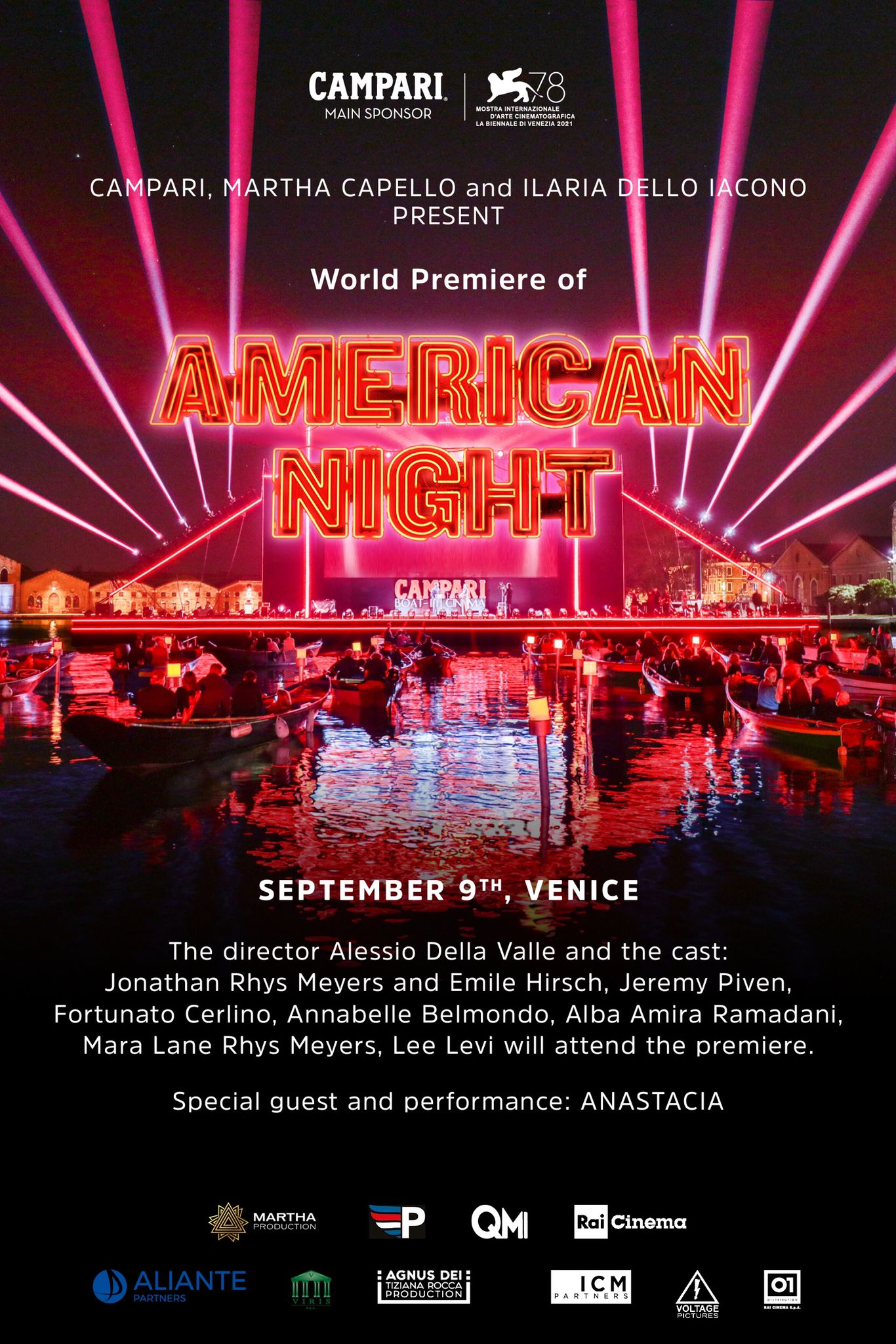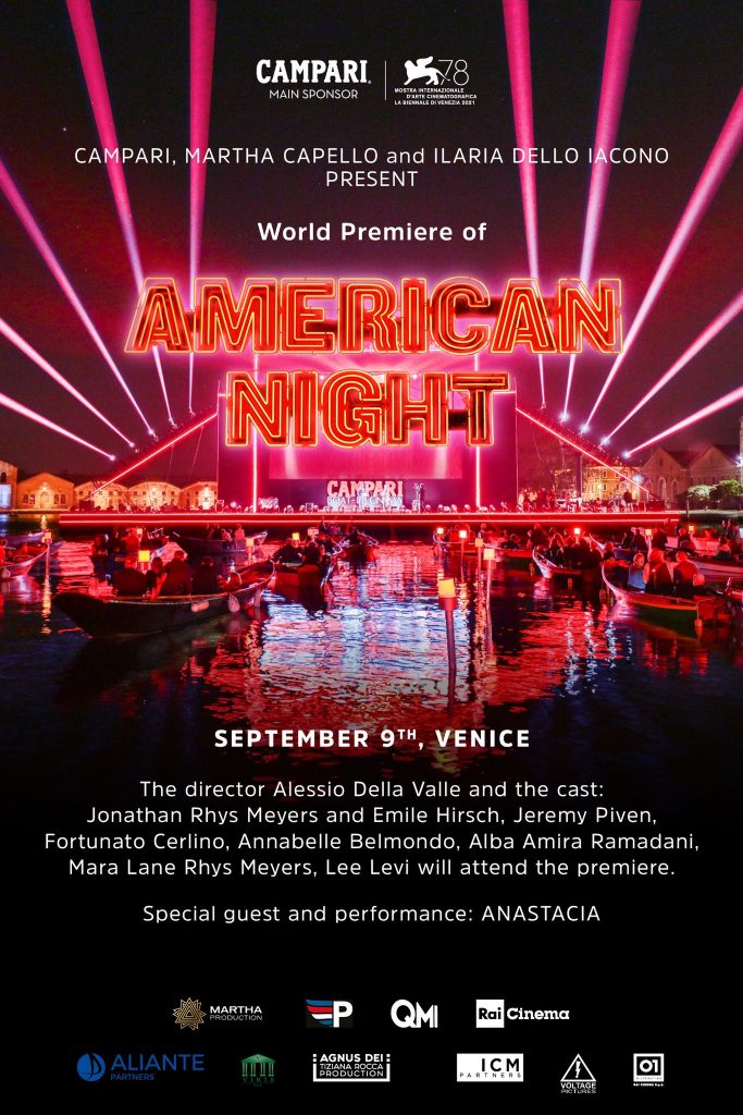 Giovedì 9 settembre in occasione della78° Mostra Internazionale d’Arte Cinematografica di Venezia, si terrà al Campari Boat-In l’anteprima mondiale del film American Night, diretto da Alessio Della Valle ed una produzione Martha Production, Pegasus Entertainment e QMI con RAI Cinema SpA, un film neo-noir ambientato nel mondo dell’arte contemporanea Newyorkese, e si svolgerà il Vernissage della mostra collettiva in cui verranno esposte alcune opere degli artisti presenti nel film.