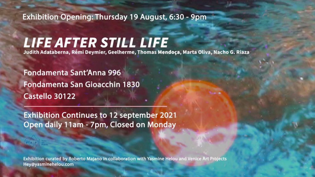 Questo sguardo graduale parte dalla sede di Fondamenta Sant'Anna, dove le sculture, creature monocromi modellate in terracotta realizzate da Thomas Mendoça (Francia, 1991), incarnano animali marini provenienti da un mondo fantastico. Il dipinto di Rémi Deymier (Francia, 1993) mostra una natura morta in cui un busto marmoreo condivide lo spazio con motivi vegetali che superano la tela e si liberano dalla cornice. In questo caso la natura emerge dal supporto stesso per abbracciare il muro in un intervento site specific. I motivi vegetali si collegano alle fotografie di Nacho G. Riaza (Spagna, 1988), il cui giardino domestico contrasta con un tavolo quasi vuoto post festa. Una pratica analogica che documenta la nostra dipendenza ad altri esseri attraverso dettagli estetici che potrebbero passare inosservati da ogni sguardo.