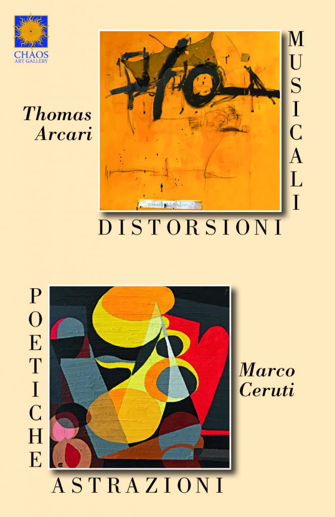 Alla Chaos Art Gallery di Vicolo Al Leon d’oro 8 a Parma, sabato 27 ottobre alle ore 18 inaugura la mostra di Thomas Arcari e Marco Ceruti “Musicali distorsioni, poetiche astrazioni”. Due diversi ma complementari artisti parmigiani che intrecciano le loro astrazioni e divagazioni musicali e poetiche, ci coinvolgeranno con un’esposizione di segni, di suoni, di sogni. Presentazione a cura di Manuela Bartolotti. Aperta fino all’8 novembre.