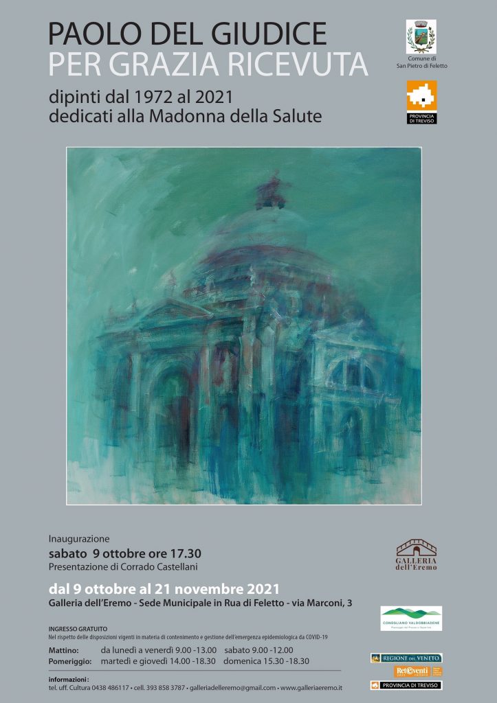 Paolo del Giudice espone alla Galleria dell’Eremo di Rua di Feletto (TV) una selezione dei dipinti che nel corso di quasi mezzo secolo ha dedicato alla Basilica della Madonna della Salute di Venezia. La mostra, progettata due anni fa prima della pandemia, si propone con un significato in qualche modo votivo, ora che il contagio sembra stia esaurendo la sua forza.