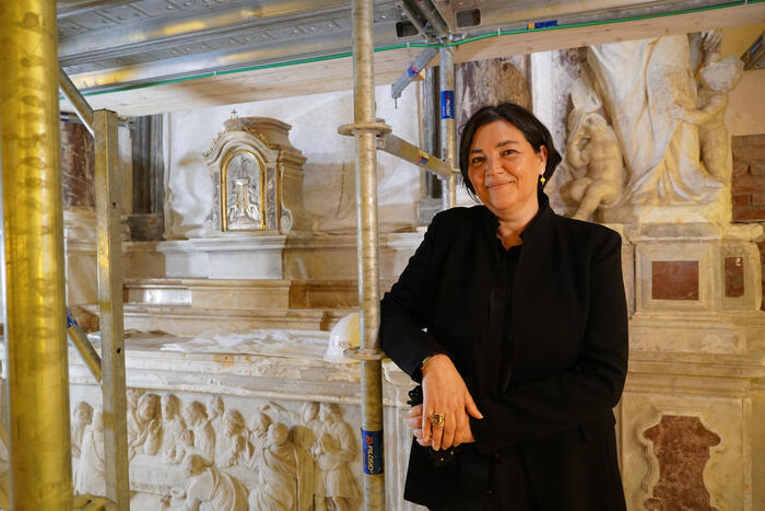 Art director e Vicepresidente di Fondaco Italia, attiva tra Roma e Venezia, Giovanna Za- botti in dialogo con Clara Tosi Pamphili - ideatrice e curatrice del programma di talk mensili a Palazzo delle Pietre - racconterà dell’inedita scelta di presentare il Padiglione come cantiere di restauro in piena attività.“Un laboratorio di riparazione collettiva”, come è stato definito, dove lavorano studi di architettura e associazioni interessate a coltivare il futuro della città, artigiani locali e restauratori di opere in pietra, marmo, terracotta, pittu- ra murale e su tela, stucco, legno e metallo, ma anche uno spazio di condivisione dove le impalcature mobili individuano configurazioni spaziali diverse, dove un grande tavolo diventa luogo di racconto e confronto, in collaborazione con gli studenti dell’Università Internazionale d’Arte di Venezia, e dove è persino possibile, su prenotazione, fare musica, con gli strumenti messi a disposizione dal Conservatorio Benedetto Marcello.