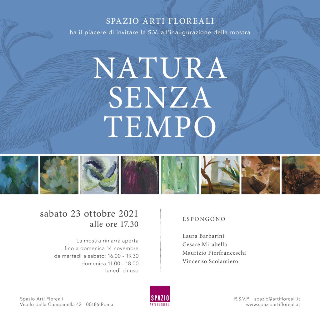 Nella nuova sede espositiva Spazio Arti Floreali di Vicolo della Campanella, a Roma, si inaugurerà, il prossimo 23 ottobre la mostra Natura senza tempo. Laura Barbarini, Cesare Mirabella, Maurizio Pierfranceschi, Vincenzo Scolamiero, primo appuntamento di un ciclo dall’omonimo titolo. L'evento, a cura di Bianca Pedace sarà in programma fino al 14 novembre.