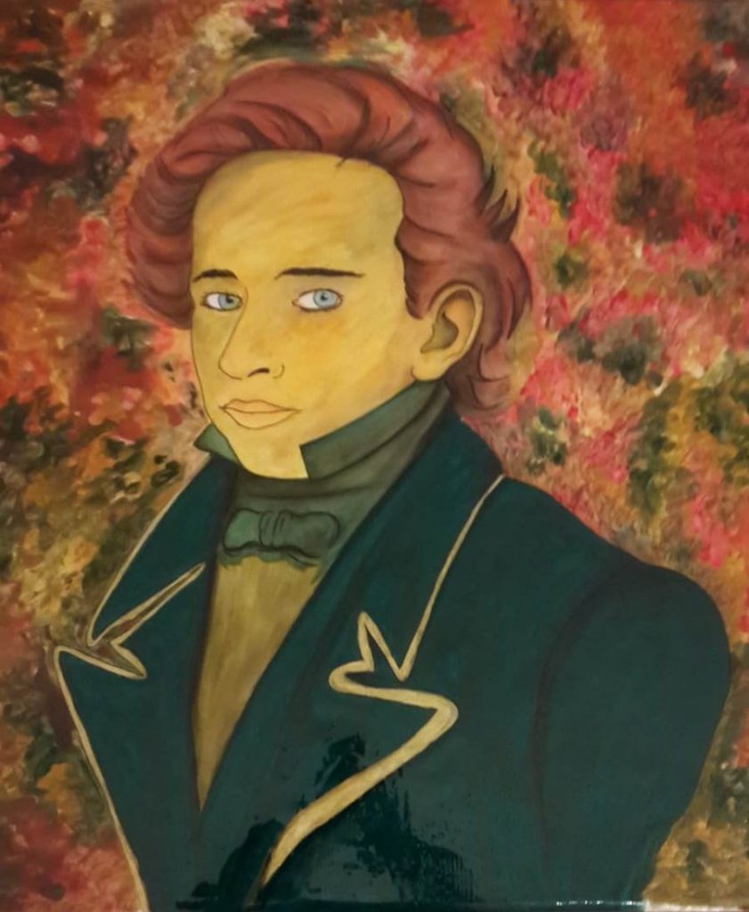 Lui lo ha dipinto sui tavoli e sulle pareti del Caffè Piazza Leopardi in maniera onirica ossia esternando la sua anima anche a livello fisico, ne consegue sia un ritratto similare a quelli del suo periodo storico ma anche un ritratto completamente nuovo, in cui si vede il Leopardi bello, avvenente, leggiadro e a tratti seducente.