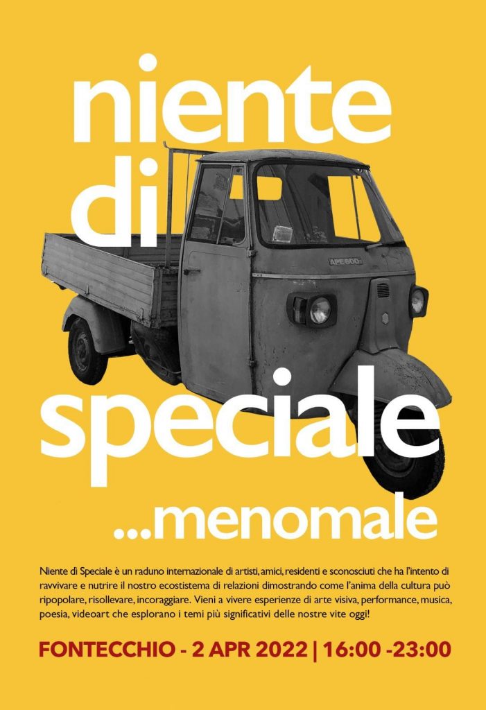 In un momento storico in cui accade di tutto, dalla pandemia all’innesco di una guerra che rischia ogni giorno di diventare mondiale, per gli artisti residenti a Fontecchio la cosa migliore che ci si possa augurare per il futuro è che, appunto, niente di speciale accada. La realtà ormai è iperbole di se stessa, perciò concetti quali la specialità, la straordinarietà rappresentano paradossalmente l’ordinario. La conquista di una qualche normalità piuttosto, è la vera chimera a cui tendere. “Niente di speciale… Menomale” quindi, si configura come la normalità auspicata, sognata, desiderata che si dipana tra i vicoli di Fontecchio e si concretizza nelle cantine riempite d’arte, sia essa figurativa, astratta o concettuale, di foto, di performance artistiche e teatrali, di letture, di musica, di contenuti audio e video.