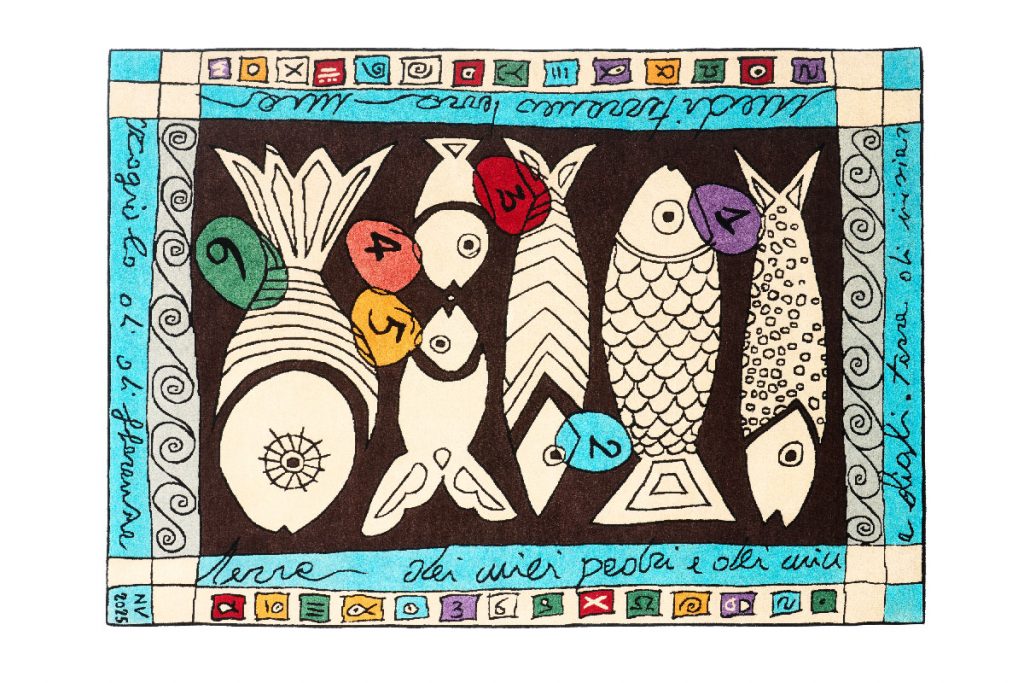 In esposizione i nuovi tappeti tibetani annodati a mano, accanto a sculture iconiche come Afrodite (2005), Derviscio (2011) e Maialino da parata (2021). Non mancano lavori evocativi come il candelabro Anime – Pesci (2005) e la scultura in acciaio Ekunus Ekuna (2017).