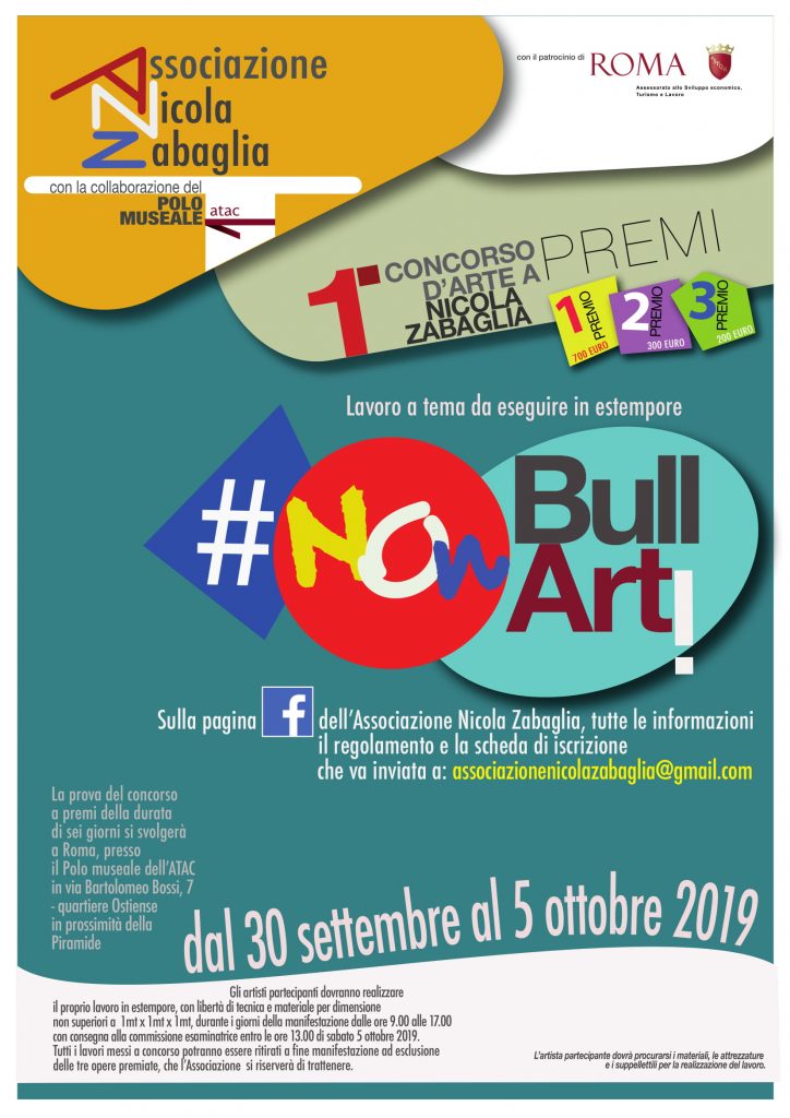 L’Associazione NICOLA ZABAGLIA ha promosso nel mese di ottobre un evento sul tema del bullismo, dal titolo #NonBullArti, che comprenderà, un concorso d’arte, un esposizione artistica, una tavola rotonda sul tema del “Bullismo” e un dibattito sulle scuole d’arte e mestieri di Roma Capitale.